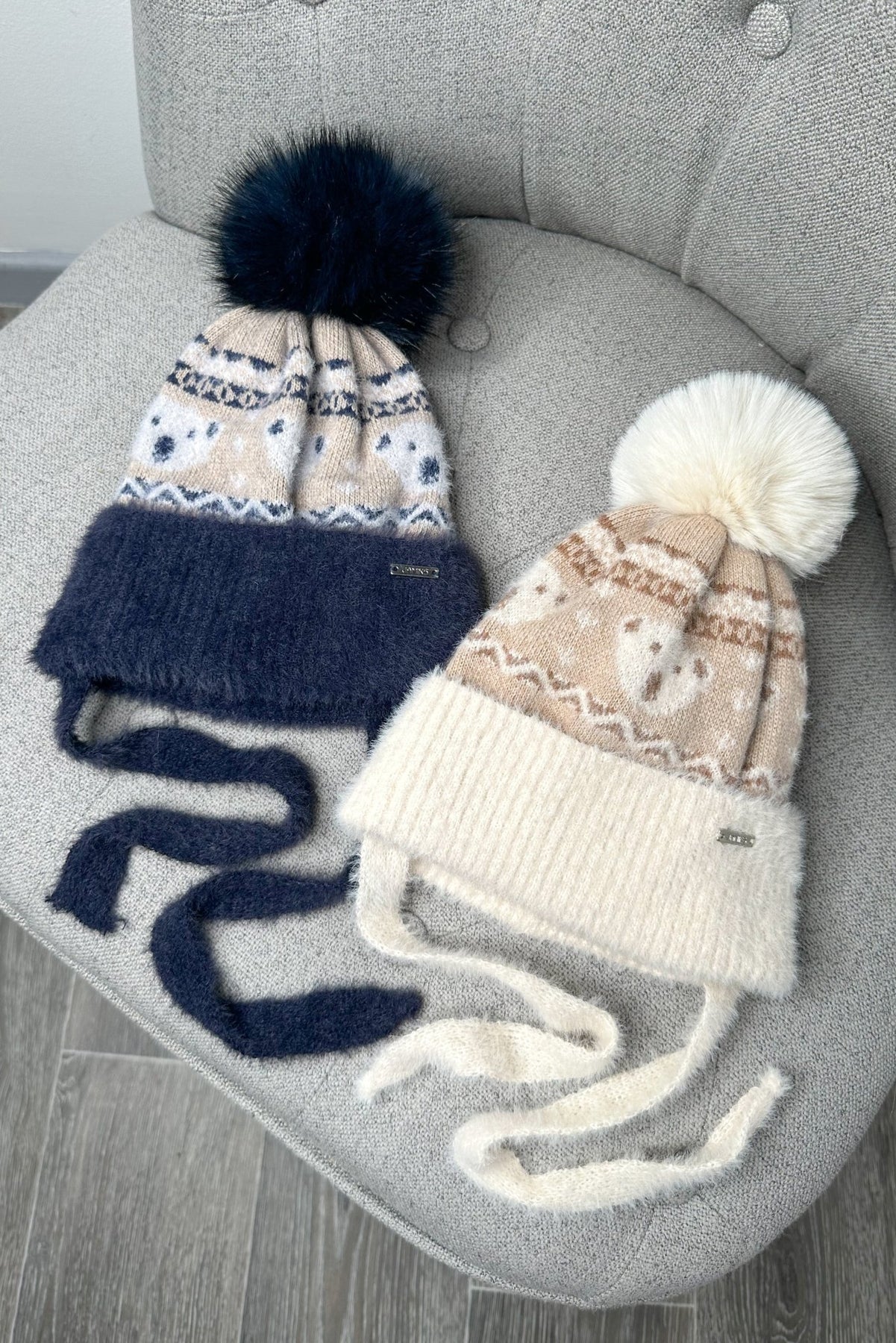 وشاح أطفال للجنسين من ماركة جاميكس البولندية. قبعة سميكة وناعمة للغاية من مزيج الصوف والكشمير، بطبعة دب تيدي بلوني الأزرق الداكن والبيج، تعلوها كرة كبيرة من الفرو الصناعي بلون أزرق داكن. مبطنة بالقطن لمزيد من الدفء.