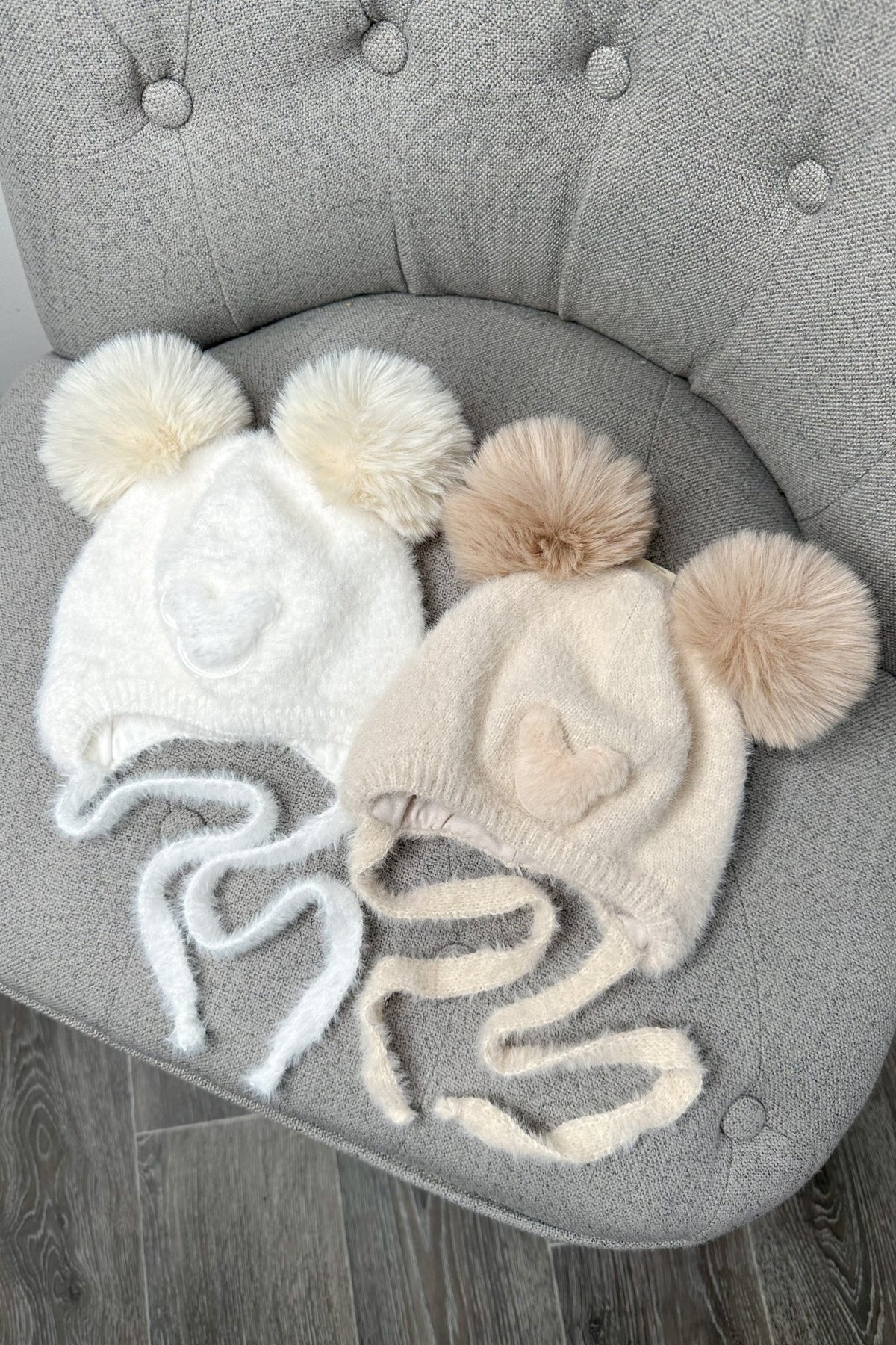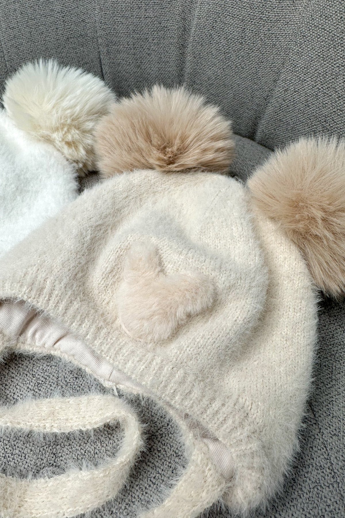قبعة أطفال للجنسين من ماركة Jamiks البولندية. قبعة سميكة وناعمة للغاية، مصنوعة من مزيج الصوف والكشمير بلون رملي، سهلة الارتداء، مزينة بكرات صوفية كبيرة من الفرو الصناعي، ومزينة برأس دب لطيف من الفرو الصناعي من الأمام. تُثبّت القبعة بأربطة تحت ذقن الطفل.