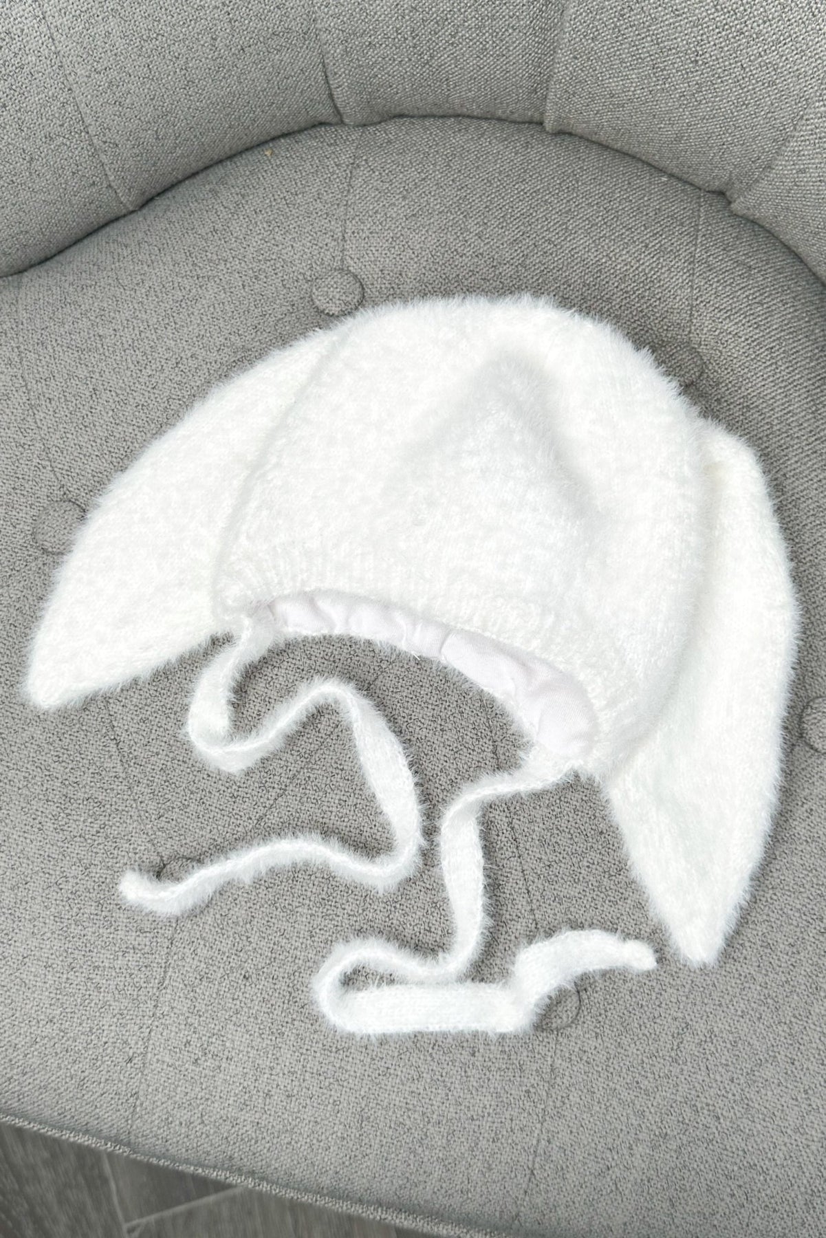 قبعة أطفال للجنسين من ماركة Jamiks البولندية. قبعة بيضاء سميكة وناعمة للغاية، سهلة الارتداء، بأذني أرنب كبيرتين. أربطة تُثبّت القبعة تحت ذقن الطفل.