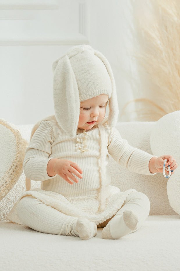 فستان بناتي براق من ماركة جاميكس البولندية. فستان خفيف الوزن محبوك بلون البيج الفاتح، بأكمام طويلة، وخصر منخفض، بخيوط فضية لامعة منسوجة في تنورة بوكليه شتوية، ومزين بثلاث فيونكات كريمية، يعلوها قلب ذهبي يحمل العلامة التجارية على الصدر.