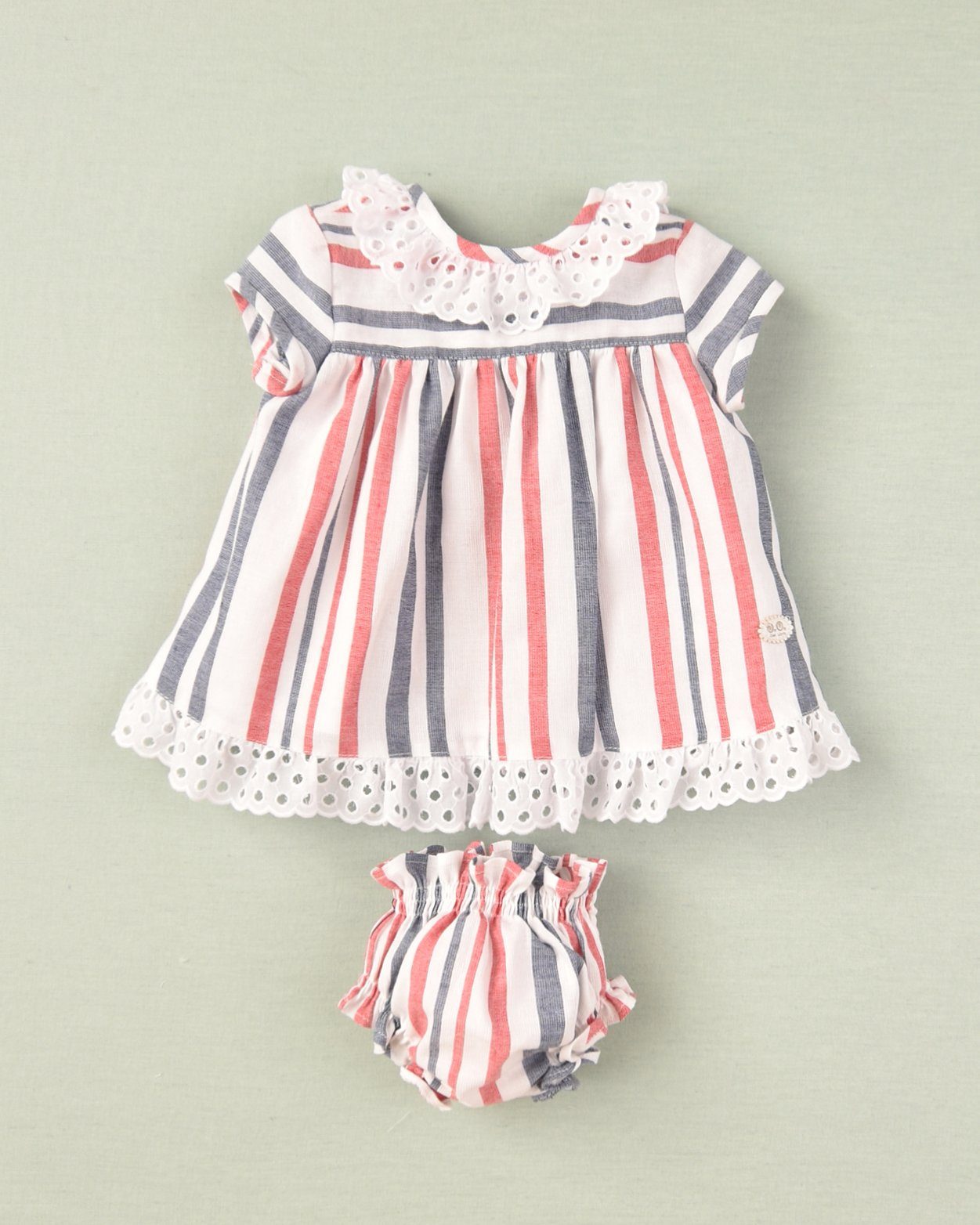 طقم فستان مخطط بطابع بحري من ماركة خوسيه فارون الإسبانية. فستان مخطط باللونين الأحمر والكحلي، مصنوع من قماش خفيف الوزن من مزيج الكتان، بظهر منسدل أنيق، مزين بعقدة، وحواف مطرزة بتطريز إنجليزي على الظهر والرقبة والحاشية. يمكن تنسيقه مع سروال داخلي مخطط بنفس اللون. تتوفر تصاميم متناسقة.