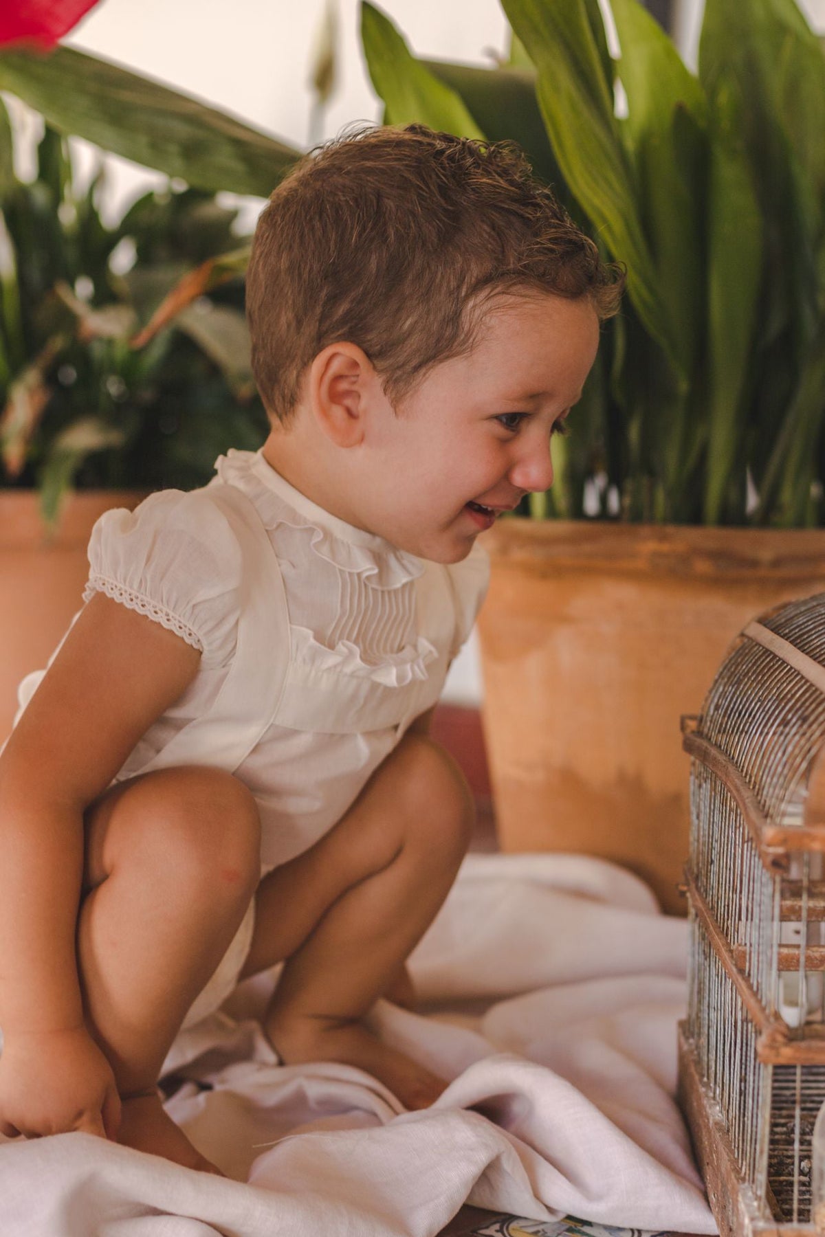 طقم أطفال للجنسين من ماركة خوسيه فارون الإسبانية. قميص كريمي خفيف الوزن بأكمام قصيرة وياقة مكشكشة صغيرة أسفل بنطال كريمي من الدانتيل مع دعامات على شكل حرف H، مع حواف من الدانتيل وشريط جلدي يحمل العلامة التجارية على الساق.