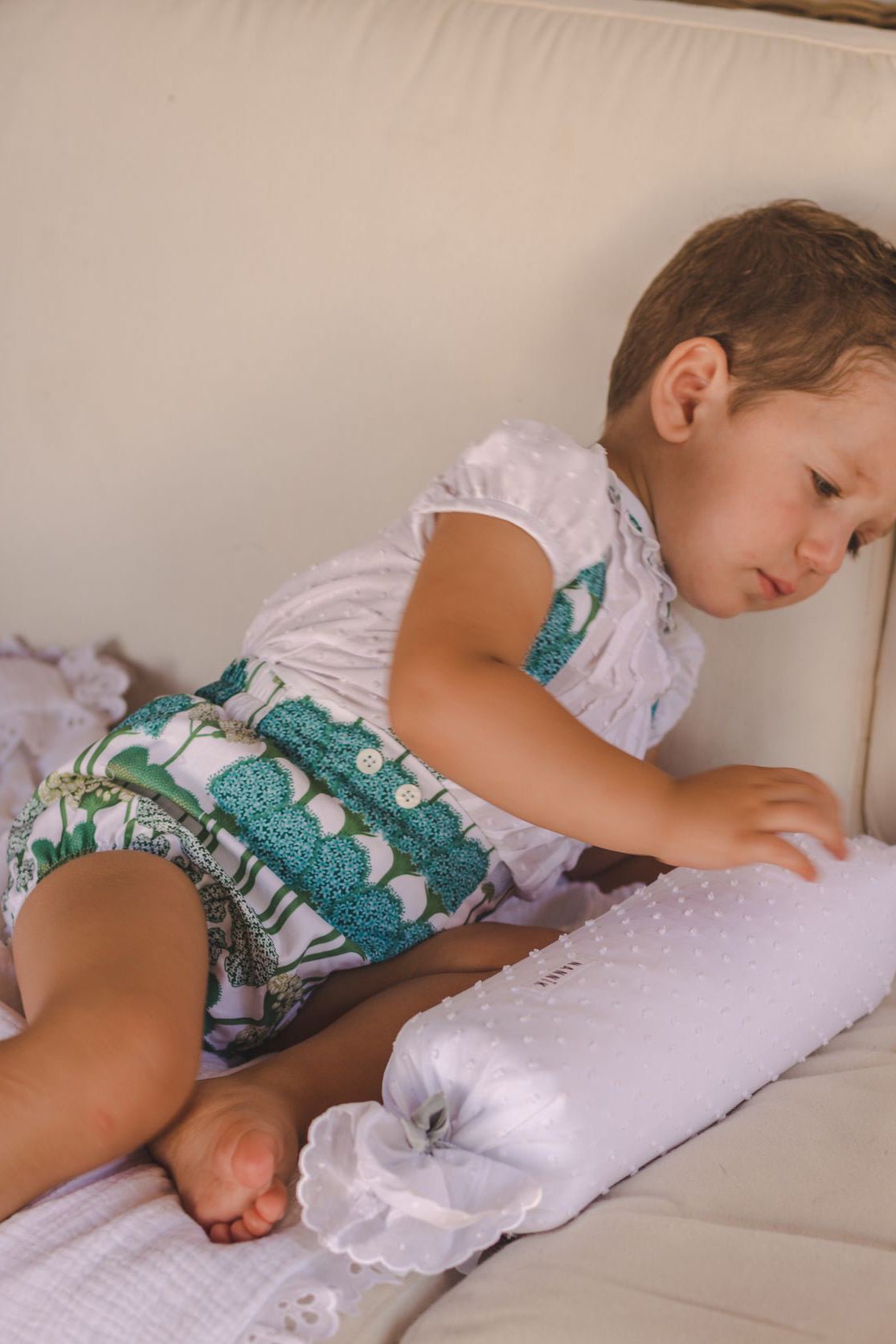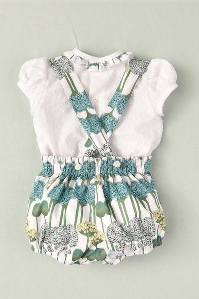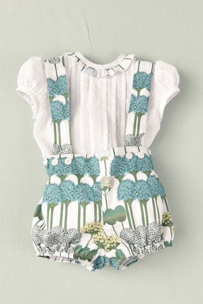 طقم ملابس للأولاد من ماركة خوسيه فارون الإسبانية. قميص أبيض منقط بأكمام قصيرة، أسفل بنطال جينز أخضر مزهر بحمالات، مصنوع من قطن ناعم وخفيف الوزن وجيد التهوية. مزين بعروة جلدية تحمل شعار الماركة على الشورت.