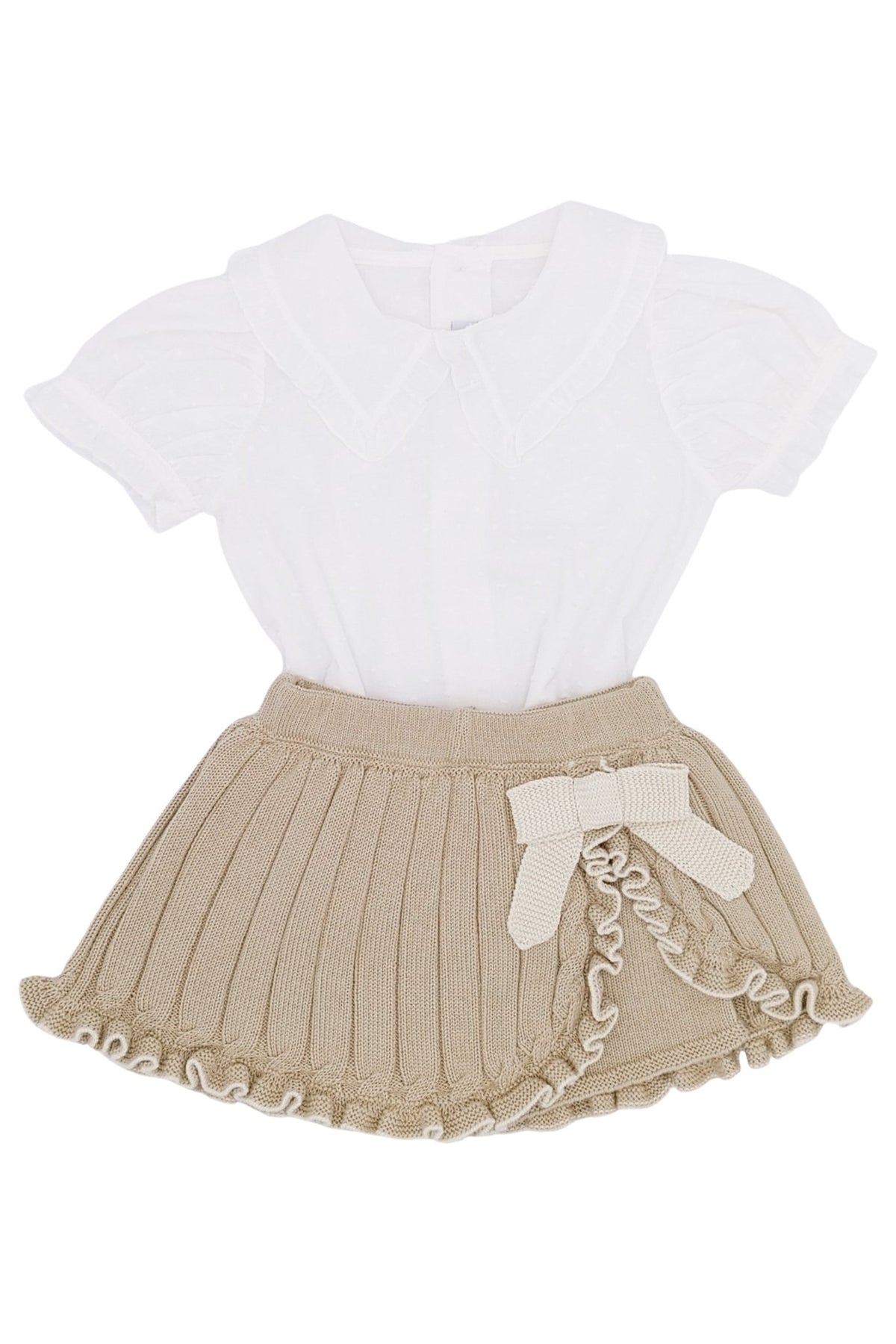 طقم راغو المكون من ثلاث قطع، طقم أنيق وعصري للفتيات الأكبر سنًا، يتميز بكارديجان محبوك بلون الجمل بتفاصيل كابل رقيقة، وأساور وحاشية صدفية بحواف كريمية، وفيونكة محبوكة بلون الكريم أنيقة عند الصدر. تضفي البلوزة البيضاء المنقطة لمسة من السحر الكلاسيكي بياقتها الكبيرة ذات الطابع البيوريتاني وحوافها المكشكشة، وأزرار من عرق اللؤلؤ على الظهر. يمكن تنسيقها مع تنورة قصيرة محبوكة بلون الجمل متناسقة، مصممة بنسيج عريض الأضلاع وحواف مكشكشة، وفيونكة كريمية لإطلالة أنيقة وراقية.