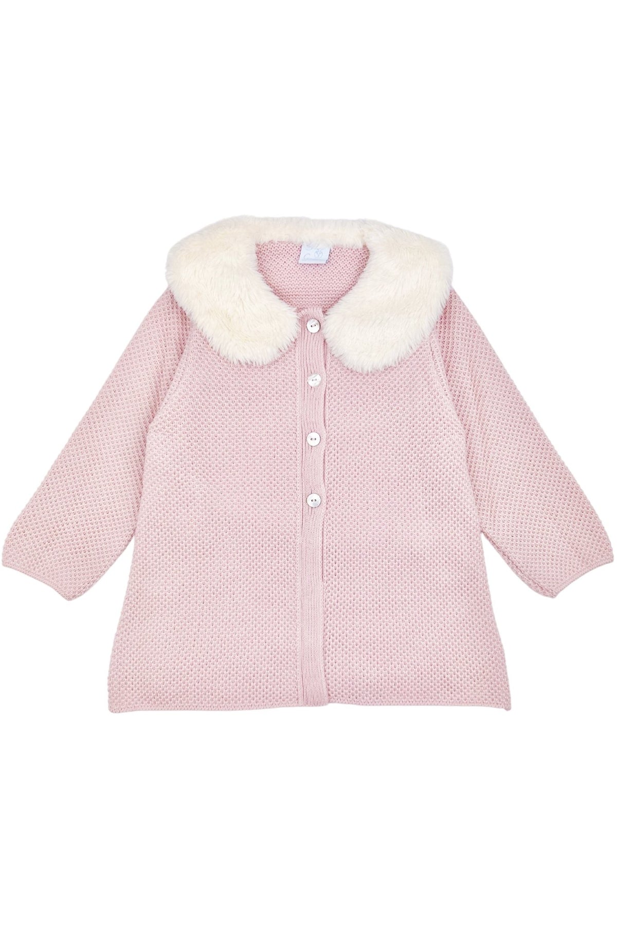 جاكيت محبوك للجنسين من تصميم جرانلي الإسباني. جاكيت متوسط الوزن، محبوك بنمط الوافل، بأكمام طويلة، بتصميم حرف A، بلون وردي داكن، مع ياقة من الفرو الصناعي العاجي الناعم للغاية.