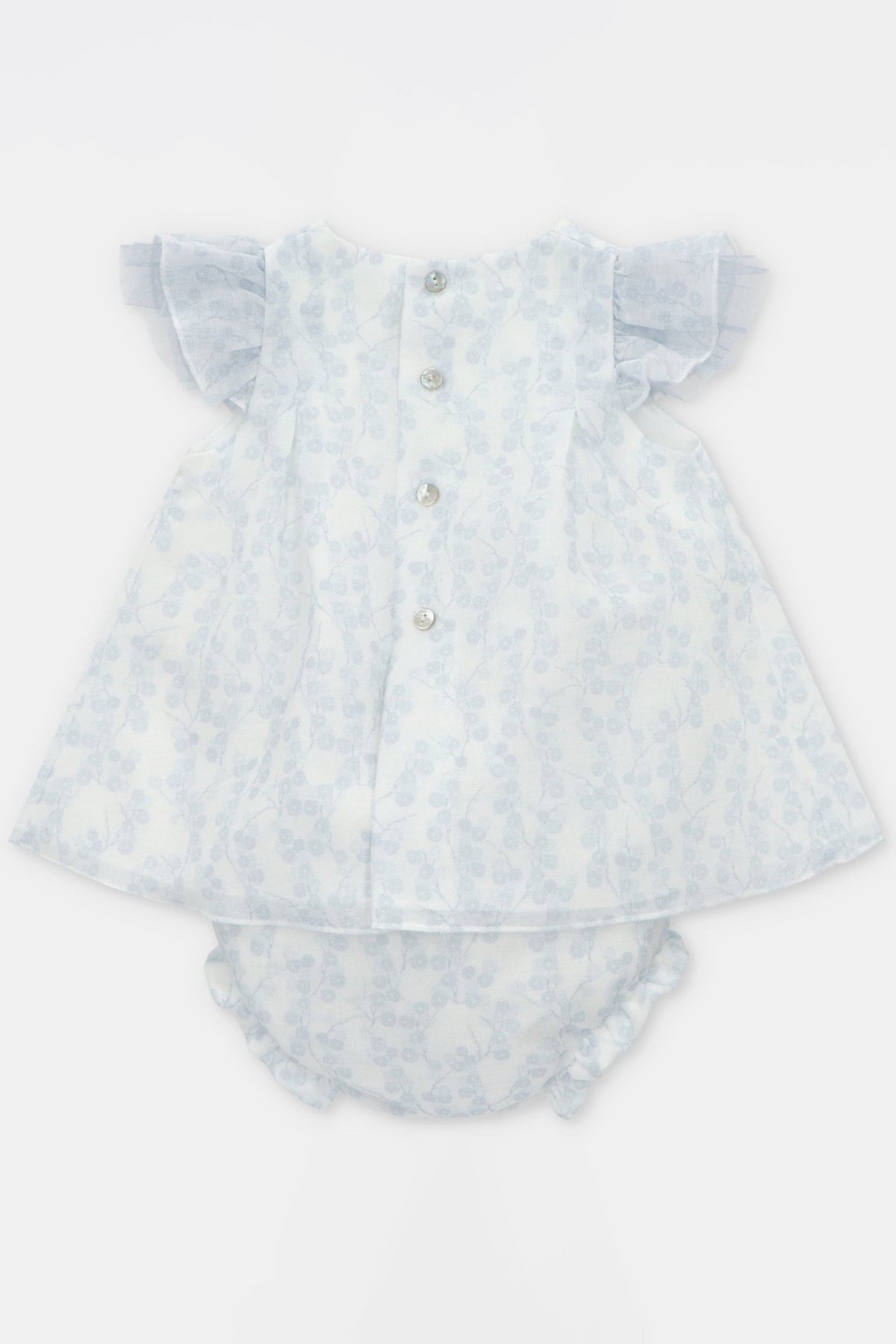 طقم فستان طفلة من مارتن أراندا . فستان أزرق فاتح مزهر بصدرية مطوية وكشكشة تول زرقاء فاتحة أنيقة على الأكمام. مزين بفيونكة ساتان يعلوها قرص فاخر من عرق اللؤلؤ يحمل شعار الماركة. يكتمل الطقم ببنطال قصير مزهر متناسق.