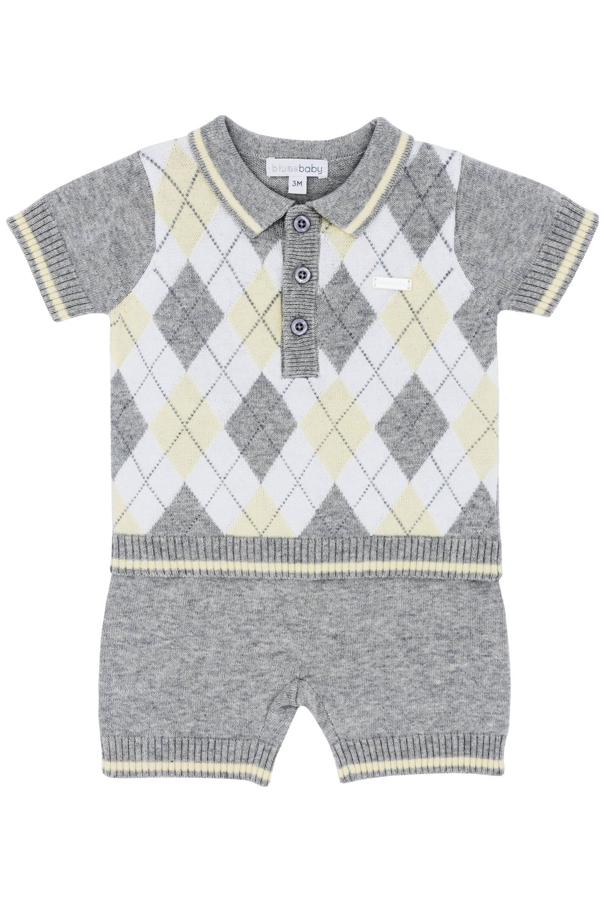 طقم ملابس محبوكة للأولاد من العلامة التجارية البريطانية بلوز بيبي . أضف لمسةً من التألق إلى خزانة ملابس طفلك الصغير مع هذا الطقم المكون من قميص بولو خفيف الوزن وشورت بنقوش أرجيل باللونين الرمادي والليموني. إنه الزي المثالي والمريح لأي مناسبة، وخاصةً عيد الفصح!
