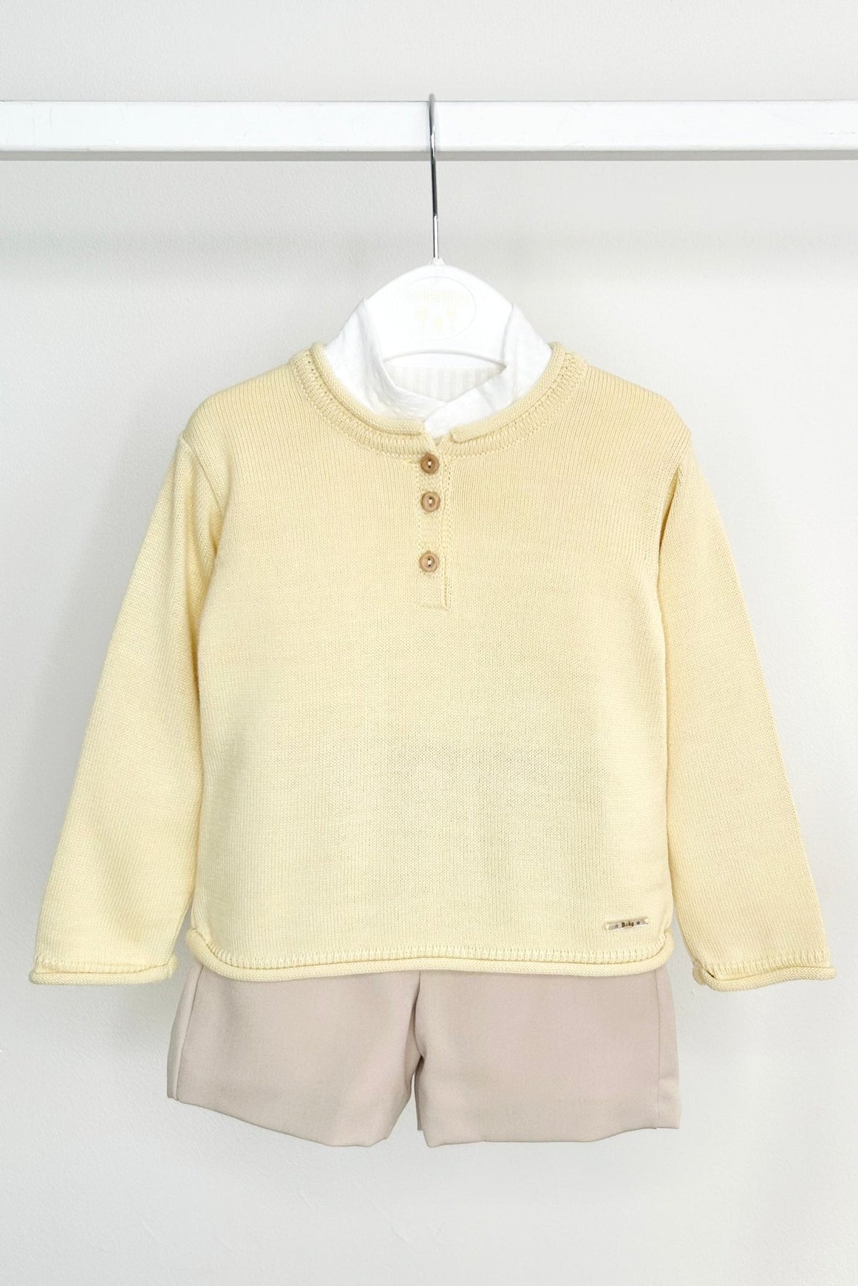 هذا الطقم الكلاسيكي البسيط المكون من ثلاث قطع من فالنتينا بيبيز، قطعة أساسية لا غنى عنها للأولاد الصغار. سترة خفيفة الوزن محبوكة بلون أصفر فاتح، توفر ملمسًا ناعمًا ومرنًا مع أزرار خشبية جذابة في الأمام. قميص قطني أبيض مخطط من قماش السيرساكر، بطبقات تحتية، يضفي ملمسًا ناعمًا وأناقة خالدة. يكتمل المظهر ببنطال بلون الحجر - مبطن لمزيد من الراحة - مع بنطال رياضي للأولاد الصغار (18 شهرًا) وشورت قصير مُفصل للأولاد الأكبر سنًا (24 شهرًا فأكثر). خيار مثالي للمناسبات الخاصة أو للارتداء اليومي الأنيق.