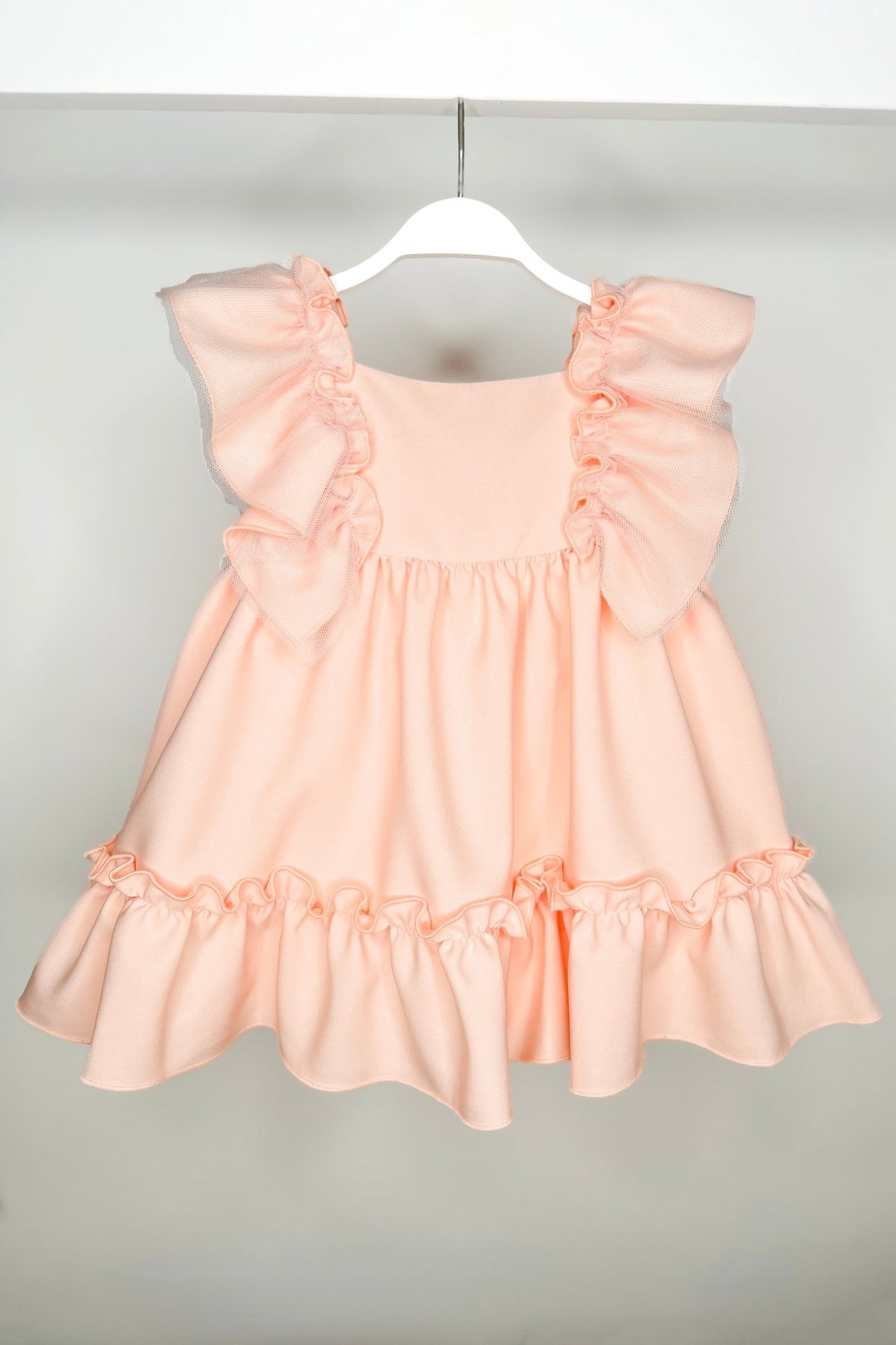 فستان بناتي من ماركة إيف تشيلدرن الإسبانية. فستان ناعم وخفيف الوزن من قماش سكوبا بلون الخوخ الصيفي، بأكمام واسعة أنيقة ومزينة بكشكشة، ومُزين بتول أنثوي.