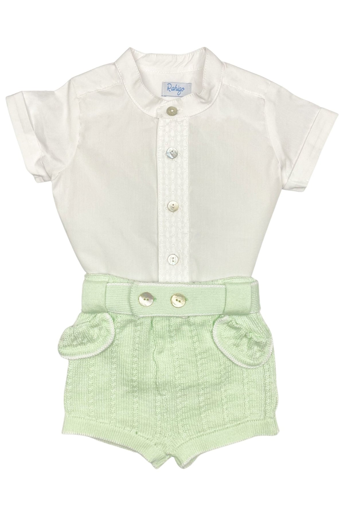 طقم ملابس محبوك للأولاد من مجموعة ربيع وصيف ٢٠٢٣ للعلامة الإسبانية " راهيغو ". قميص أبيض خفيف الوزن بأكمام وياقة، مزين بتطريز إنجليزي أنيق في المنتصف، أسفله كارديجان محبوك ناعم متوسط الوزن بلون النعناع، مع شورت قصير متناسق وحزام.
