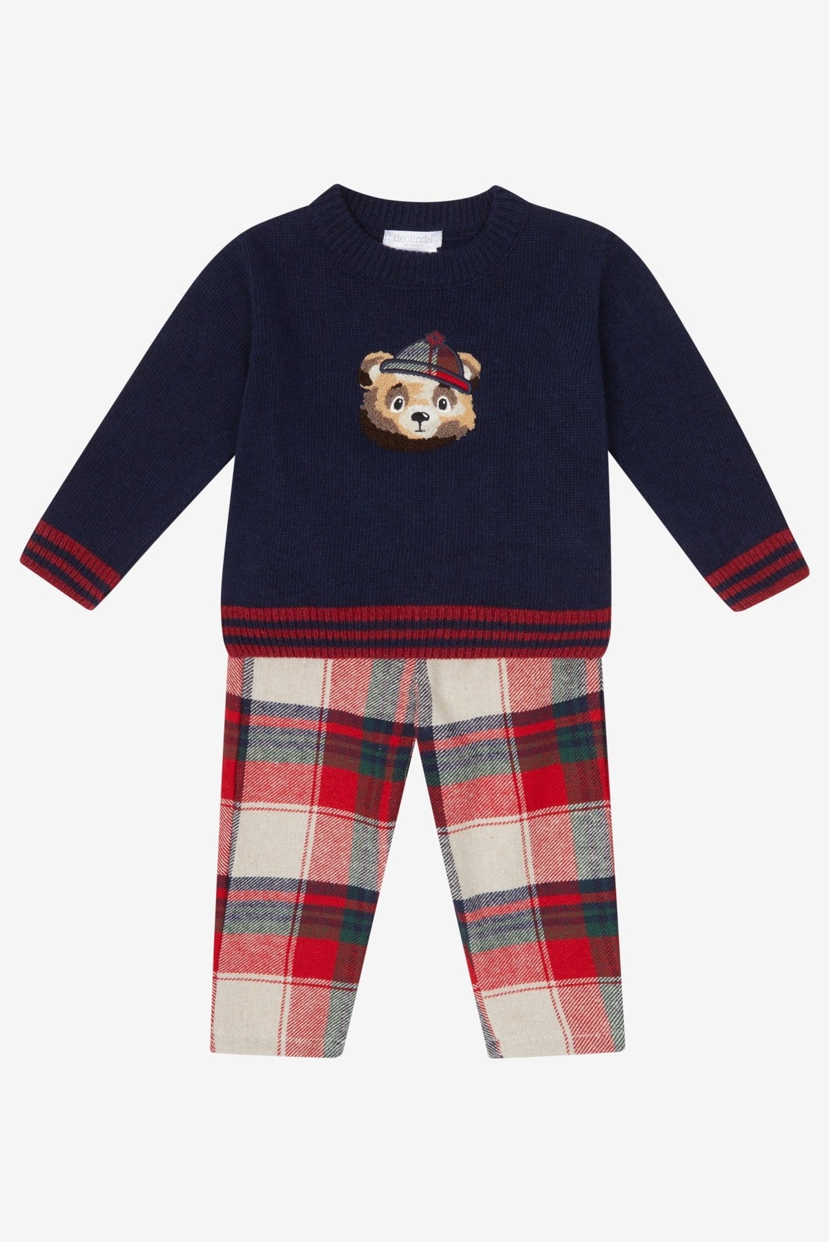 "Hamish" Navy Knit Bear Jumper & Red Tartan Trousers