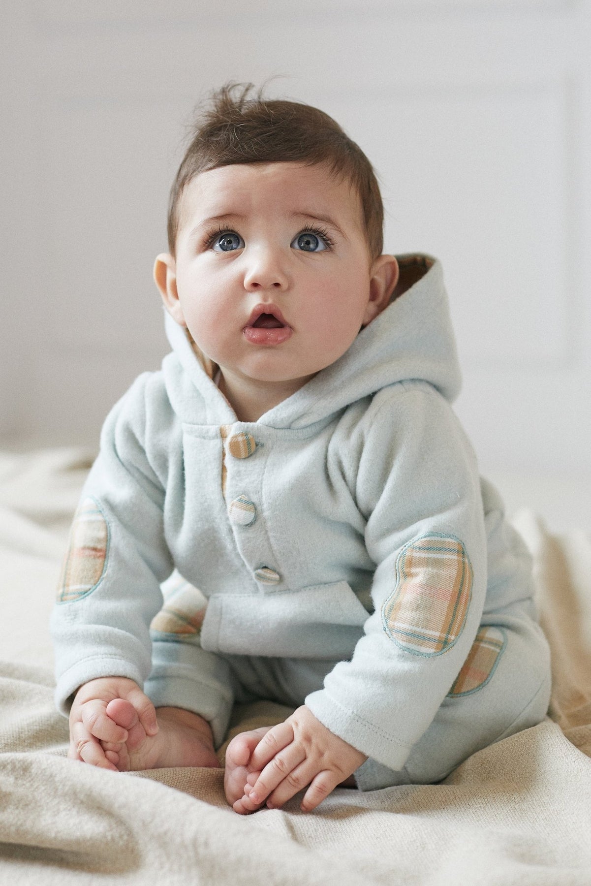بدلة رياضية للأولاد من القطن الممشط من مجموعة ديوليندا البرتغالية لخريف وشتاء 2023. مصنوعة من القطن الممشط فائق النعومة ومتوسط الوزن، بغطاء رأس بلون أخضر حكيمي، مع غطاء رأس منقوش بنقشة تارتان، وأزرار، وبقع على الكتفين والركبتين.