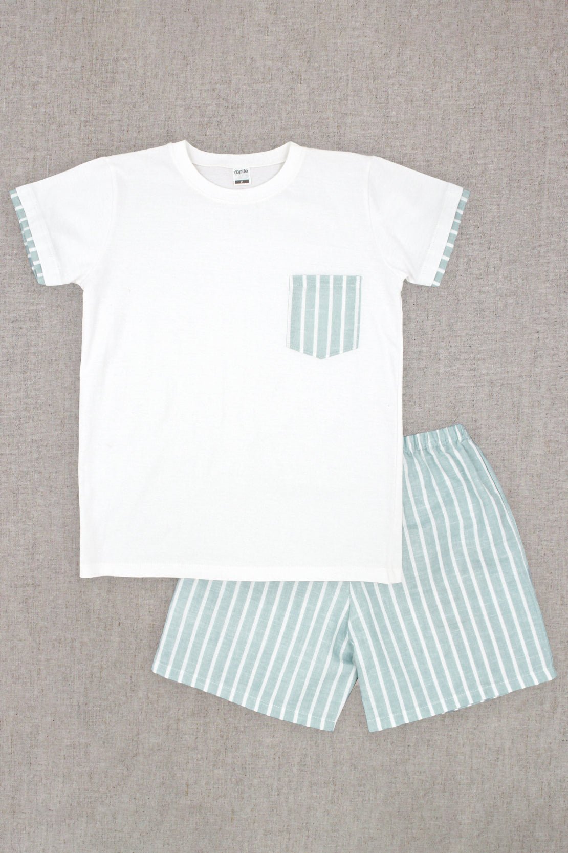 طقم تيشيرت وشورت أنيق من رابيف يجمع بين الراحة والتصميم الأنيق. يتميز هذا الطقم المصنوع من القطن الممشط العاجي بأكمام قصيرة وجيب وحواف مخططة باللونين الأزرق المخضر الفاتح والعاجي. يكتمل الطقم بشورت خفيف الوزن من مزيج الكتان بخصر مطاطي يوفر التهوية والراحة. مثالي للطقس الدافئ، سيحافظ هذا الطقم على انتعاش صغيرك طوال اليوم.
