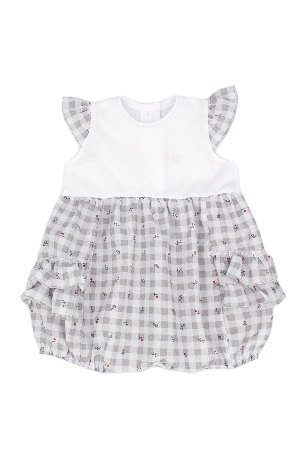 رومبر بناتي من مجموعة ربيع وصيف ٢٠٢٢ من ماركة رابيف الإسبانية. جزء علوي من قطن جيرسي أبيض فائق النعومة، مع شورت مربعات رمادية وبيضاء مزين بنقشة زهور حمراء، مع كشكشة على المؤخرة وأكمام قصيرة مكشكشة.