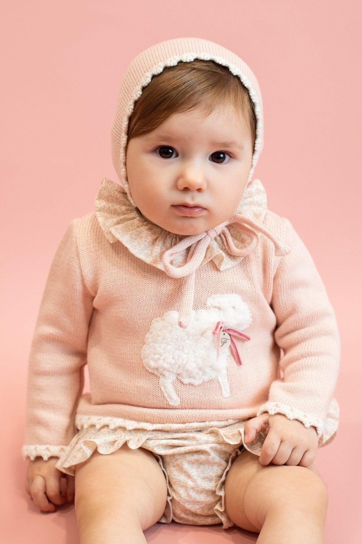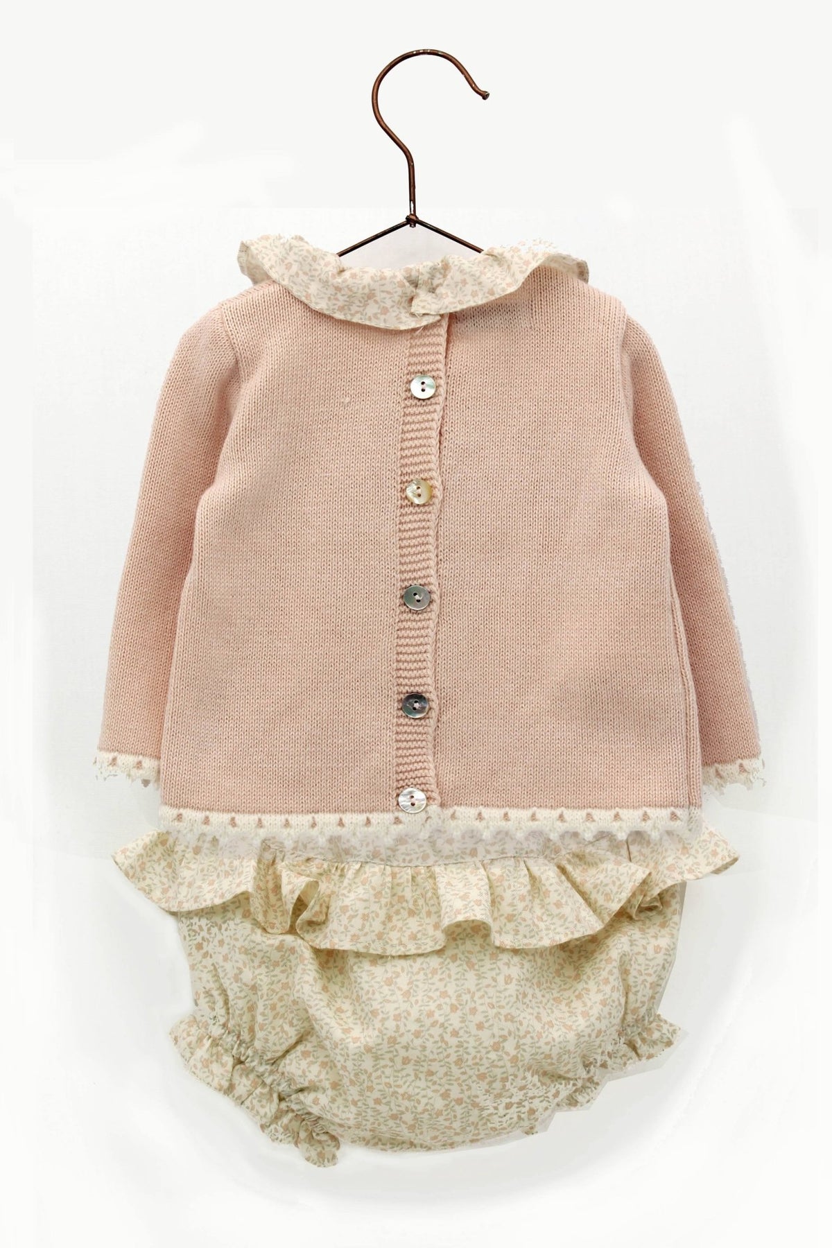 طقم رائع من بلوزة محبوكة بلون الخوخ مع سروال داخلي من ماركة فوك الإسبانية. بلوزة محبوكة بلون الخوخ بأكمام طويلة من مزيج الكشمير، وياقة مكشكشة بنقشة زهور عتيقة، ومزينة بتطريز ناعم من صوف الأغنام، تعلوها عقدة مخملية وردية داكنة. يكتمل الطقم بسروال داخلي متناسق بلون الخوخ مع كشكشة بنقشة زهور عتيقة.