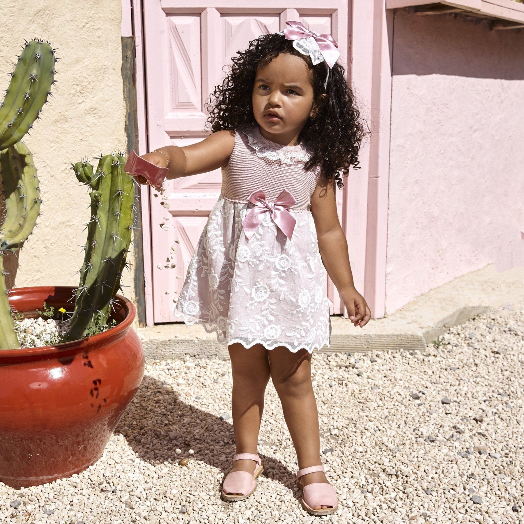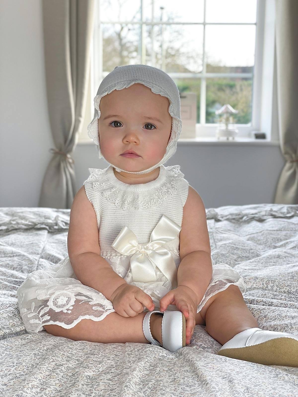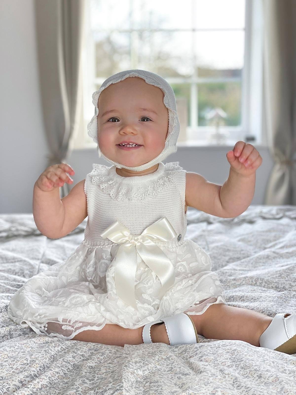 فستان رائع من تصميم المصممة الإسبانية جوليانا ، مزين بطبقة من الدانتيل. توب محبوك ناعم مع تنورة دانتيل أنيقة، مزينة بشريط دانتيل عند الياقة وعقدة ساتان كبيرة في المنتصف، مع قبعة محبوكة متناسقة.