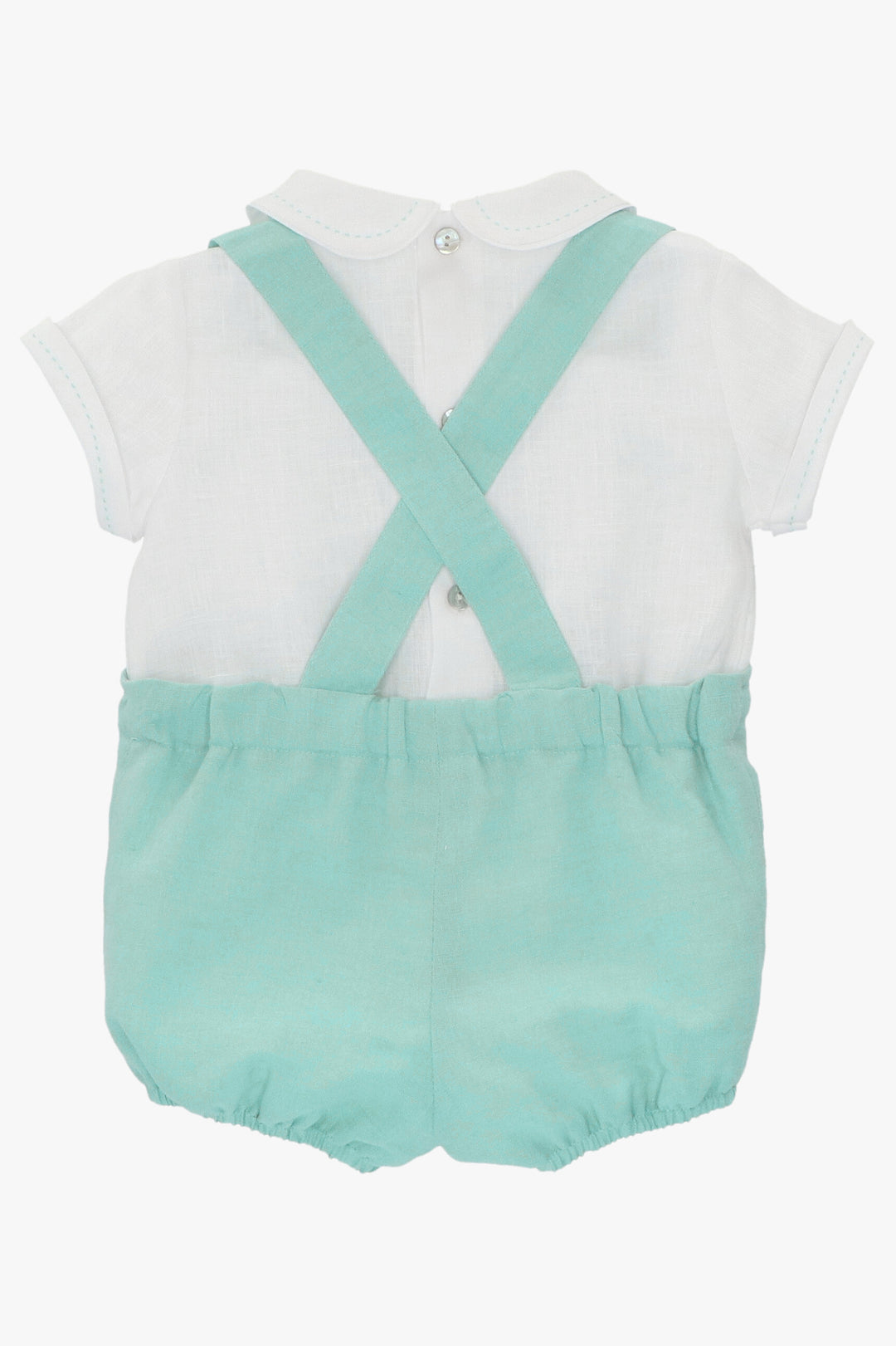 طقم ملابس للأولاد من المصمم الإسباني مارتن أراندا . قميص أبيض خفيف من الكتان بأكمام قصيرة، مزين بأزرار جوز الهند، أسفل بنطال جينز من مزيج الكتان بلون بيض البط مع دعامات. مزين بشريط فاخر من عرق اللؤلؤ الطبيعي يحمل العلامة التجارية على الساق.