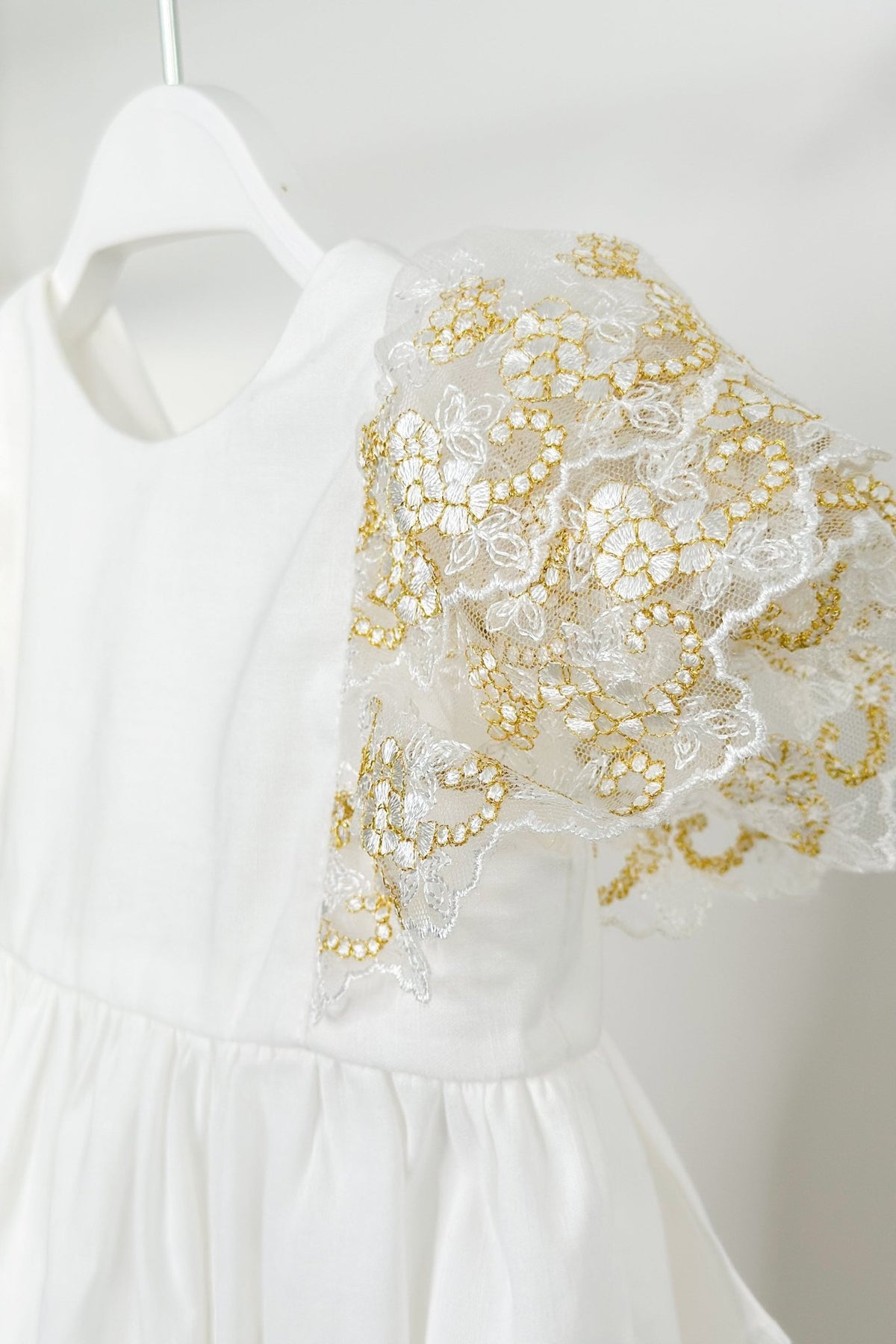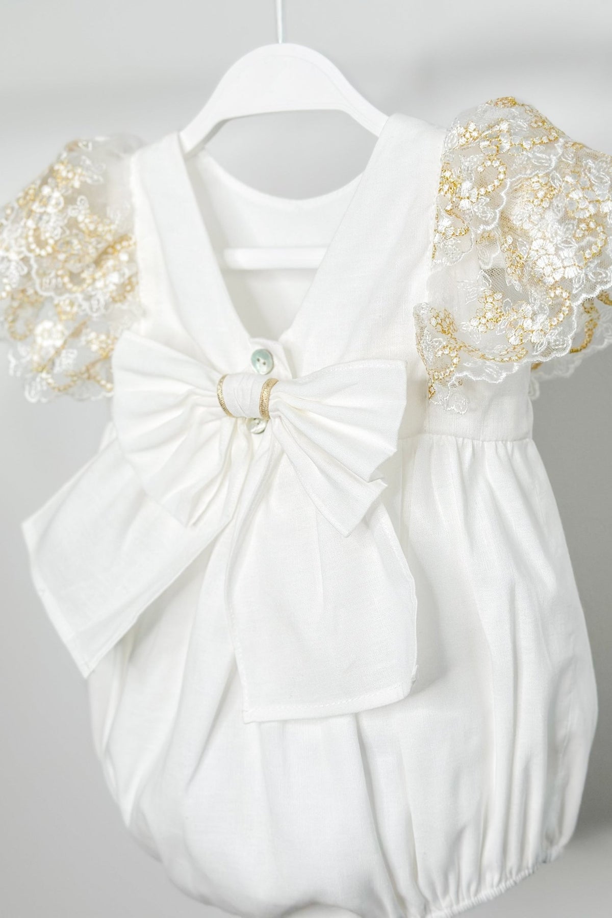 رومبر عاجي للبنات من العلامة التجارية الهولندية فوف إيتس . خفيف ومنعش، هذا الرومبر العاجي المنسوج من القطن مثالي لأي مناسبة خاصة. يتميز بأكمام من الدانتيل الذهبي متعدد الطبقات وعقدة كبيرة أنيقة على الظهر المنخفض، مما يجعله مثاليًا على الشاطئ المشمس أو في الكنيسة.
