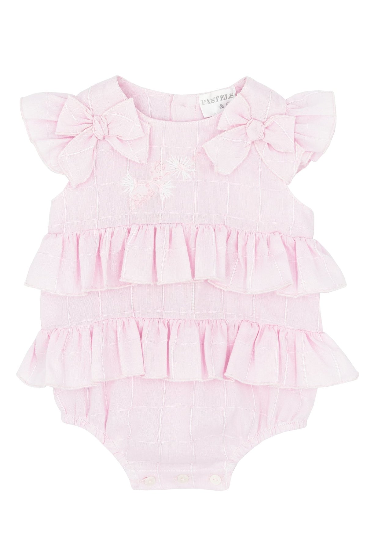 رومبر بناتي من مجموعة ربيع وصيف ٢٠٢٤ من العلامة التجارية البريطانية باستيلز آند كو . شورت خفيف الوزن مطرز بنقشة المربعات الوردية، مع كشكشة أنثوية على الجسم والأكمام، مزين بفيونكتين وزهور بيضاء ووردية جميلة مطرزة على الصدر.