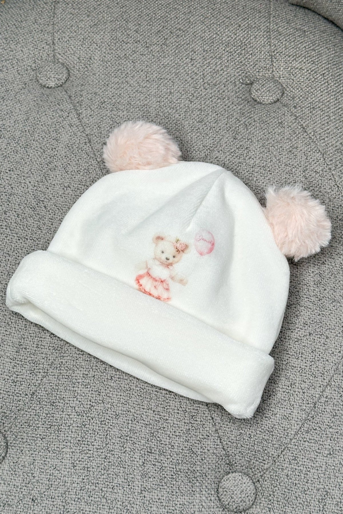 قبعة مخملية فائقة الجمال من ماركة Jamiks البولندية. قبعة عاجية ناعمة للغاية مع كرات فرو صناعي وردية خوخي جذابة، وطبعة دب وردية فاتحة في الأمام.