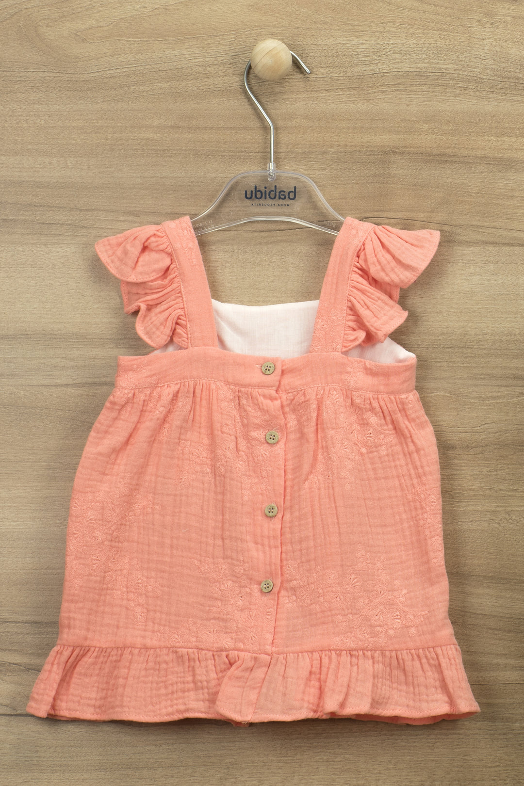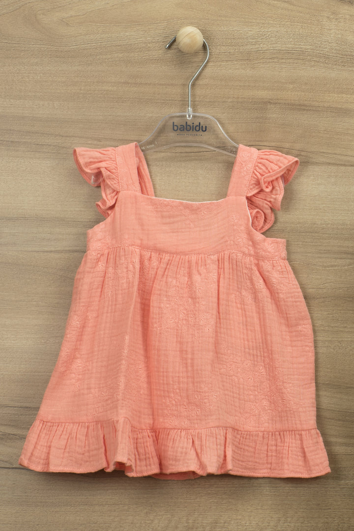 فستان صيفي للبنات من ماركة Babidu الإسبانية. فستان خفيف من الدانتيل، مُغطى بقماش شاش، مع كشكشة على الكتفين والحاشية.