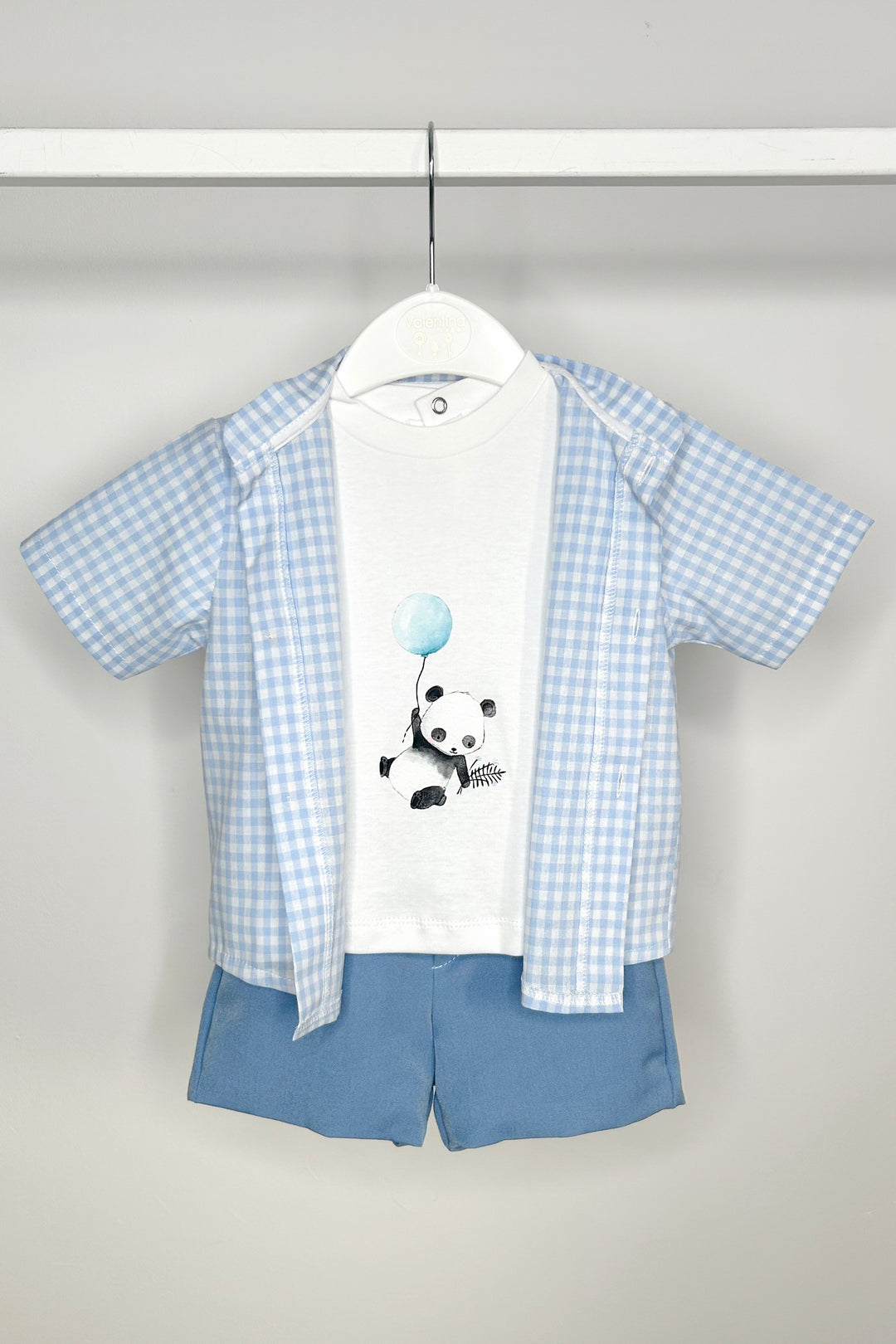 طقم مرح وأنيق للمستكشفين الصغار! هذا الطقم المكون من ثلاث قطع من فالنتينا بيبيز يتضمن قميصًا مربعات بأزرار باللونين الأزرق الفاتح والأبيض، مثالي للارتداء فوق بعضها. تحته، تيشيرت ناعم وخفيف الوزن مزين بباندا لطيف يحمل بالونًا، مما يضفي لمسةً من الأناقة. يكتمل الطقم ببنطال قطني أزرق داكن - بنطال ضيق للأولاد الصغار (١٨ شهرًا) وشورت أنيق طويل للأولاد الأكبر سنًا (٢٤ شهرًا فأكثر). مصمم لتوفير الراحة والأناقة البسيطة، هذا الطقم لا غنى عنه للأيام المشمسة واللحظات المميزة.