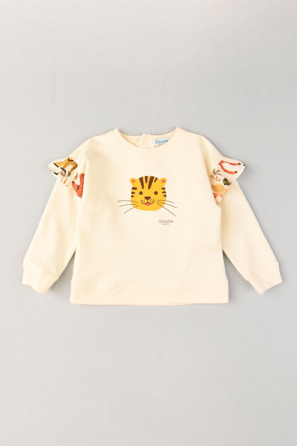 بلوزة قطنية من الجيرسيه باللون الكريمي للفتيات الصغيرات مع نقشة نمر رائعة وكشكشة مطبوعة على شكل غابة على الأكمام من مجموعة ربيع/صيف 2022 للعلامة التجارية الإسبانية Cocote .