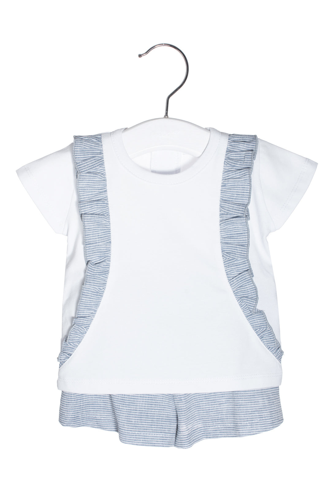 طقم ملابس بناتي من ماركة كوكود الإيطالية. تيشيرت خفيف الوزن من قطن الجيرسيه المطاطي مزين بكشكشة مخططة باللون الأزرق الداكن، مع شورت مخطط خفيف الوزن للغاية من مزيج الكتان الأزرق الداكن.