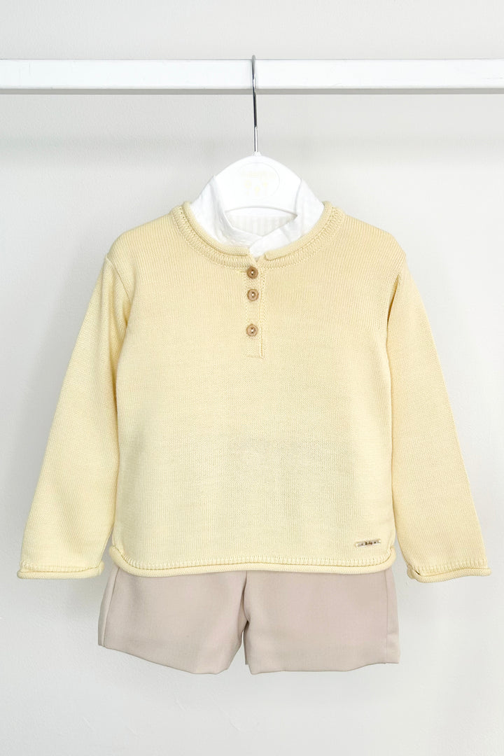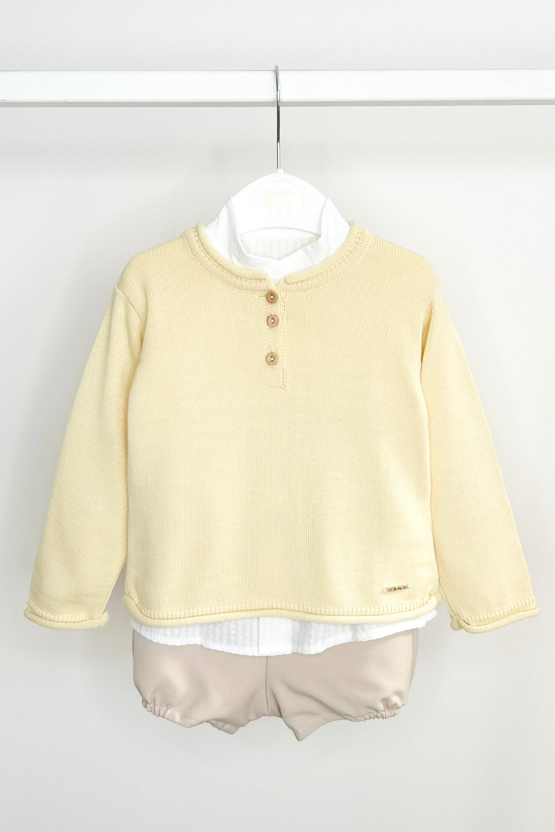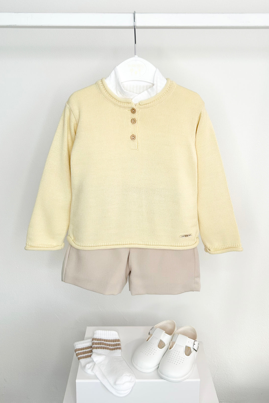 هذا الطقم الكلاسيكي البسيط المكون من ثلاث قطع من فالنتينا بيبيز، قطعة أساسية لا غنى عنها للأولاد الصغار. سترة خفيفة الوزن محبوكة بلون أصفر فاتح، توفر ملمسًا ناعمًا ومرنًا مع أزرار خشبية جذابة في الأمام. قميص قطني أبيض مخطط من قماش السيرساكر، بطبقات تحتية، يضفي ملمسًا ناعمًا وأناقة خالدة. يكتمل المظهر ببنطال بلون الحجر - مبطن لمزيد من الراحة - مع بنطال رياضي للأولاد الصغار (18 شهرًا) وشورت قصير مُفصل للأولاد الأكبر سنًا (24 شهرًا فأكثر). خيار مثالي للمناسبات الخاصة أو للارتداء اليومي الأنيق.