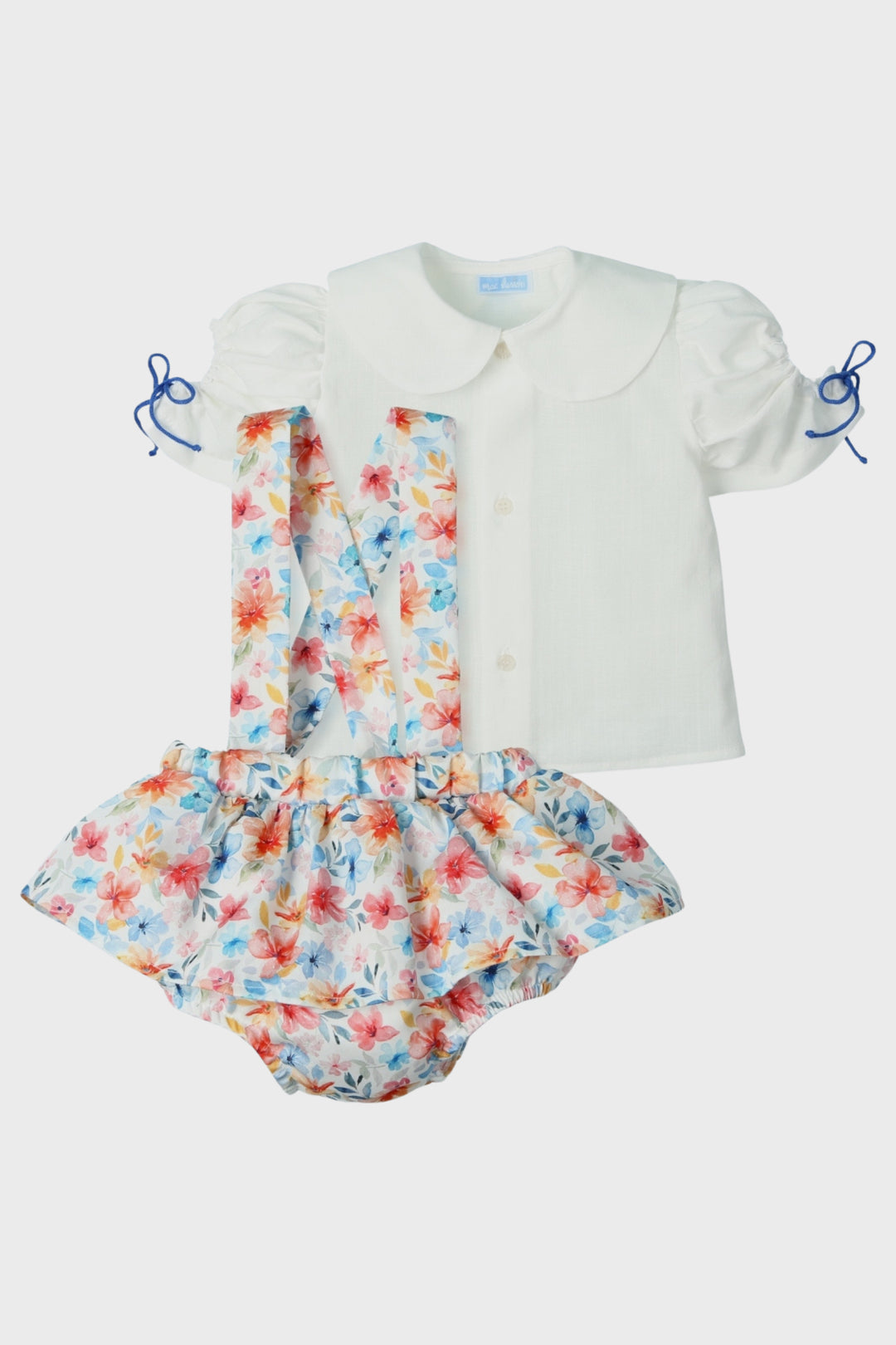 طقم ماك إيلوسيون هذا، إطلالة مميزة وجذابة لطفلتكِ، يتضمن بلوزة قطنية بيضاء خفيفة الوزن للغاية بياقة بيتر بان واسعة وأكمام قصيرة مكشكشة، مزينة بفيونكات زرقاء داكنة أنيقة. يتناسق بشكل مثالي مع تنورة بلومر بطبعة زهور مائية زاهية، مع بلومر مدمج وحمالات أزرار متقاطعة. إطلالة مرحة وأنيقة في آن واحد، مثالية للخروجات الصيفية أو المناسبات الخاصة.