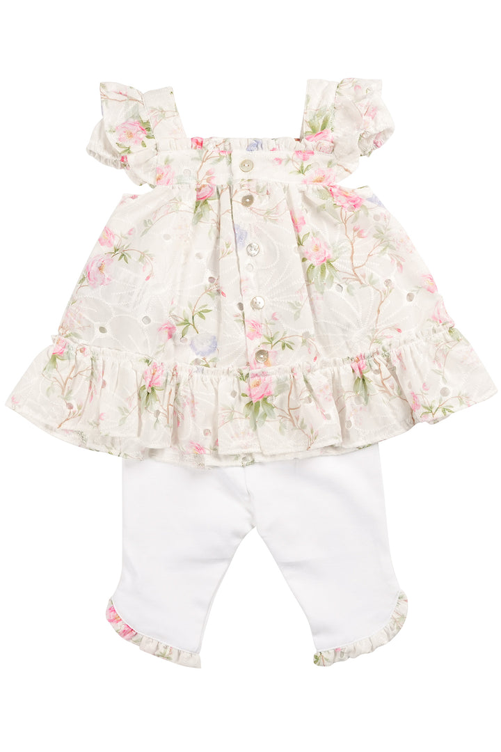 طقم مكون من قطعتين جميل من مينتيني ، يتميز بفستان مطرز بالزهور الإنجليزية وسراويل ضيقة من القطن الجيرسي الناعم لإطلالة أنيقة دون عناء. يتميز الفستان بأكمام رقيقة منفوشة، وحاشية مكشكشة، وعقدة ساتان وردية أنيقة. يُغلق من الخلف بأزرار من عرق اللؤلؤ الطبيعي. يتميز البنطال الضيق العاجي بنعومته الفائقة ومرونته ، ومُزين بكشكشة زهرية متناسقة عند الكاحلين لإضفاء لمسة ساحرة.