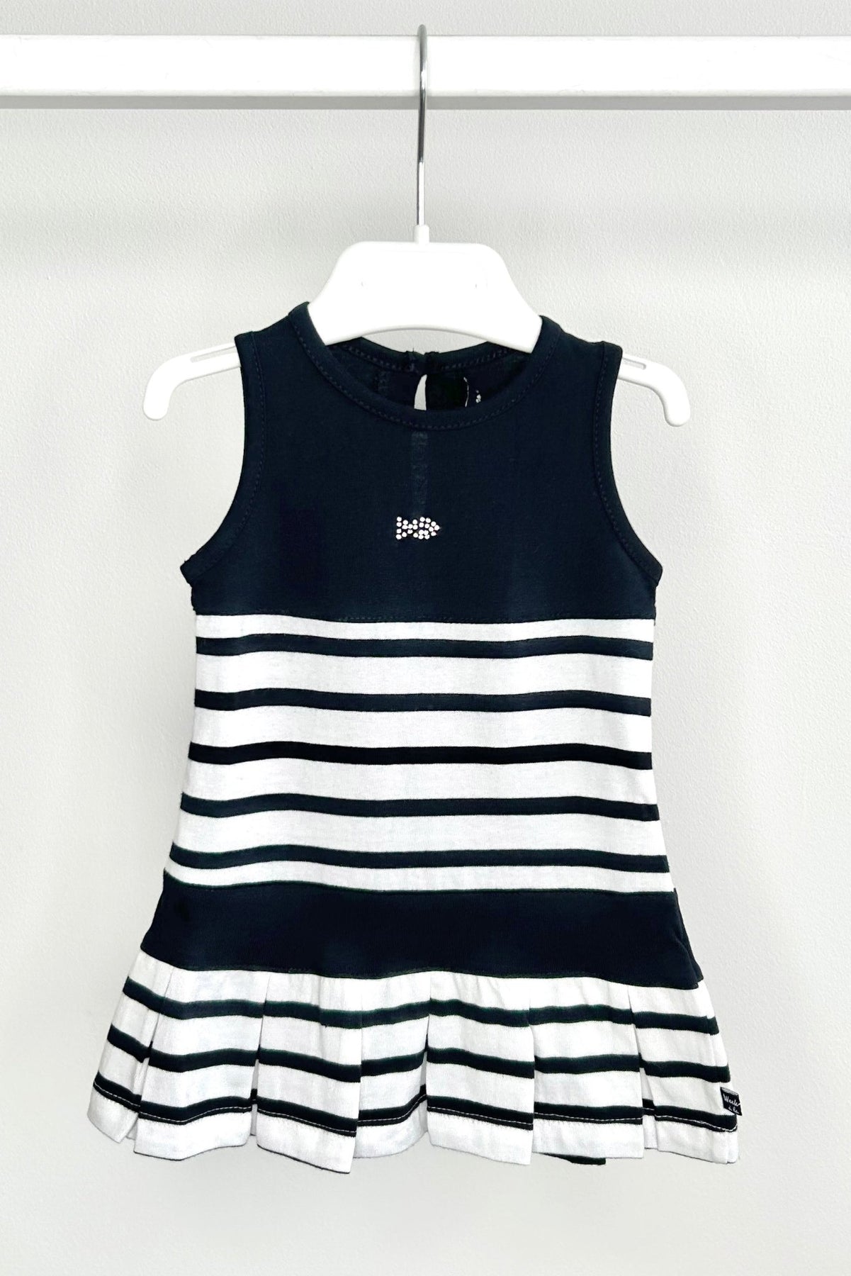 فستان قصير أنيق يناسب نزهات الشاطئ وحفلات الصيف، هذا الفستان بدون أكمام، مستوحى من أسلوب بريتون الكلاسيكي، بلونيه الأزرق الداكن والأبيض الناصع. مصنوع من قطن جيرسي ناعم وخفيف مع لمسة من المرونة، ينساب بسلاسة على الجسم قبل أن يتحول إلى تنورة مطوية تتأرجح مع كل خطوة. يتألق شكل سمكة صغيرة مرصعة بالألماس على الصدر، يلتقط ضوء الشمس على الأمواج، بينما زر أنيق في مؤخرة العنق يجعل ارتداءه سريعًا وبسيطًا. نسقيه مع صندل للرحلات اليومية أو مع كارديجان عند هبوب نسيم البحر.