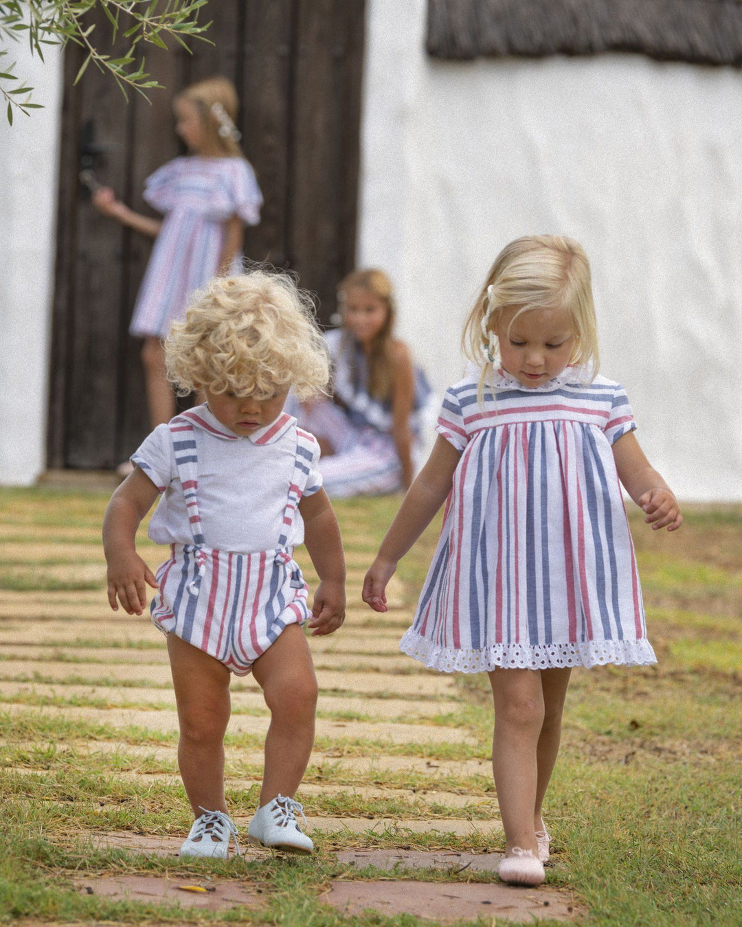 طقم فستان مخطط بطابع بحري من ماركة خوسيه فارون الإسبانية. فستان مخطط باللونين الأحمر والكحلي، مصنوع من قماش خفيف الوزن من مزيج الكتان، بظهر منسدل أنيق، مزين بعقدة، وحواف مطرزة بتطريز إنجليزي على الظهر والرقبة والحاشية. يمكن تنسيقه مع سروال داخلي مخطط بنفس اللون. تتوفر تصاميم متناسقة.