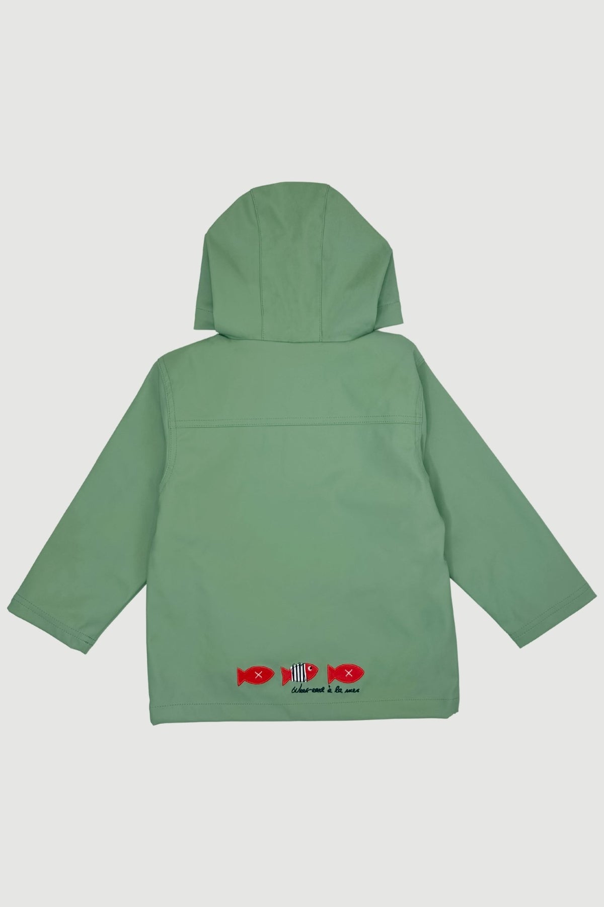 معطف واقٍ من المطر من Week-end à la Mer ، بتصميم مستوحى من رذاذ البحر، بلون رمادي غامق هادئ، يُبقي المستكشفين الصغار دافئين وجافين ومستعدين للتصوير. صُنع الغلاف الخارجي من جلد البولي يوريثان الناعم للغاية الذي تشتهر به العلامة التجارية - ناعم للغاية كأنه بشرة خوخية، ومع ذلك فهو يصد الرياح العاتية والأمطار المفاجئة بسهولة. من الداخل، بطانة من قطن الجيرسيه المخطط بأسلوب بريتون تُضفي دفئًا يسمح بمرور الهواء، بينما تُضفي سمكة مطاطية حمراء زاهية على الصدر وثلاث أسماك مزخرفة على الظهر لمسات لونية مرحة. مُجهز بسحاب ناعم وجيبين عمليين وغطاء رأس واسع، إنه الطبقة المثالية للمشي على شاطئ البحر ولقاءات اللعب والقفز في البرك.
