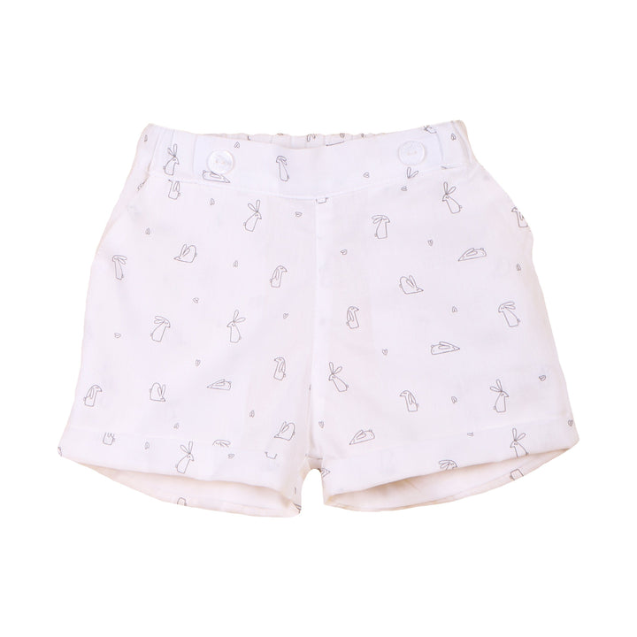 طقم رائع للجنسين من ماركة ويدوبل البرتغالية، بلوزة وشورت. تيشيرت عاجي محبوك من القطن العضوي الناعم بحواف بيج، مع شورت قطني خفيف مزين بطبعة أرنب جذابة. الشورت مزين بزرين فاخرين من اللؤلؤ.
