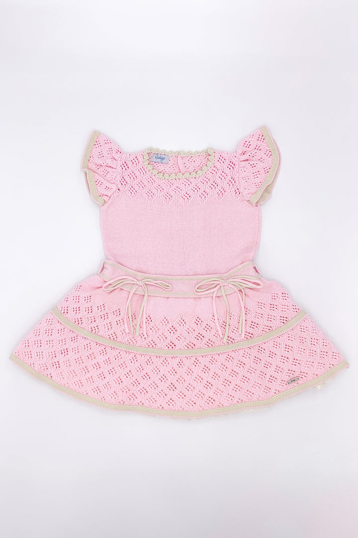 فستان بناتي محبوك من مجموعة ربيع وصيف 2024 للعلامة الإسبانية "راهيغو ". يتميز هذا الفستان الوردي الفاتح المحبوك بتصميم "بوينتيل" بخصر منسدل وأكمام مكشكشة وظهر محبوك رائع. مزين بفيونكات مزدوجة الطبقات عند الخصر.
