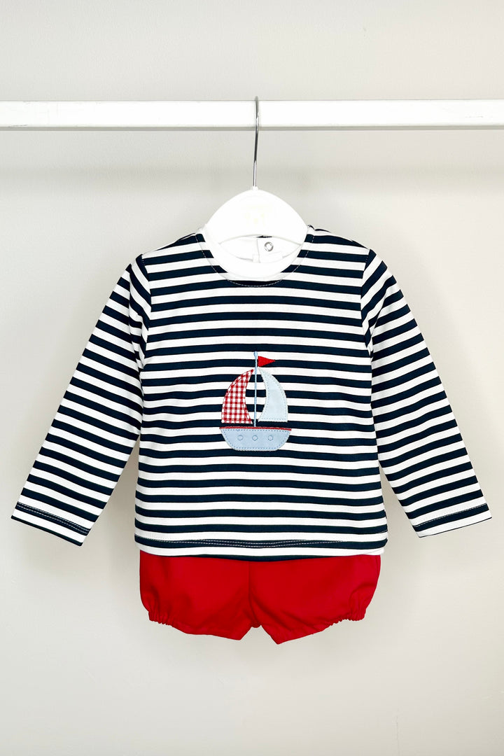 أهلاً يا صغيري! طقم فالنتينا بيبيز البحري المكون من ثلاث قطع مثالي لنزهات الشاطئ المشمسة وعطلات الصيف. يتضمن الطقم بلوزة أنيقة مخططة باللونين الأزرق الداكن والأبيض بأكمام طويلة، مصنوعة من مزيج قطني منظم، مع بطانة ناعمة بملمس الوافل، وتطريز جميل على شكل مركب شراعي. يمكن ارتداؤه فوق تي شيرت جيرسي أبيض خفيف الوزن بأكمام قصيرة بنفس التطريز، ويأتي مع بنطال أحمر - بنطال رياضي مناسب لعمر ١٨ شهرًا، وشورت مبطن أطول لعمر ٢٤ شهرًا فما فوق. أزرار خشبية سهلة الاستخدام وكباسات للإغلاق تجعل ارتداء الملابس سهلاً للغاية.