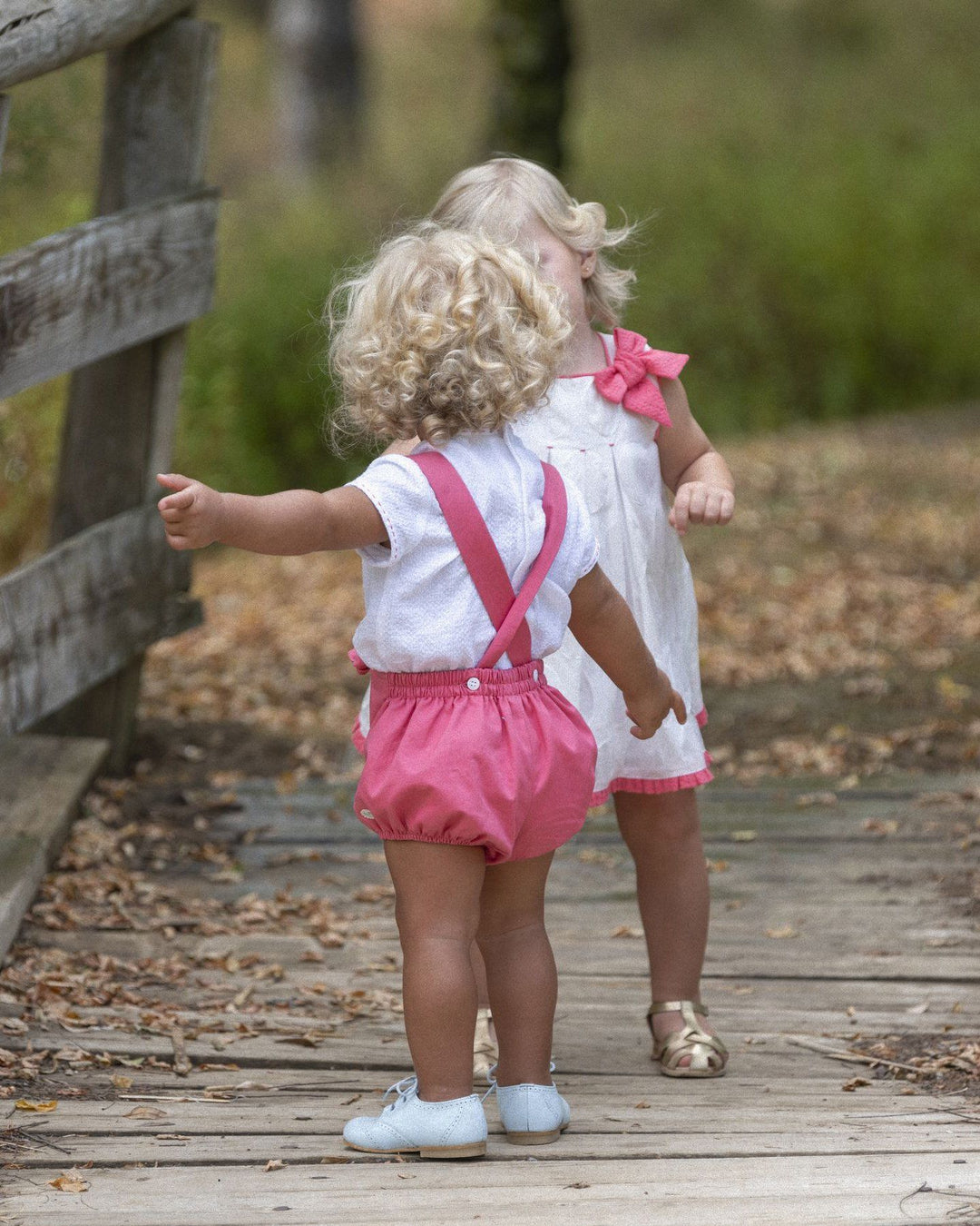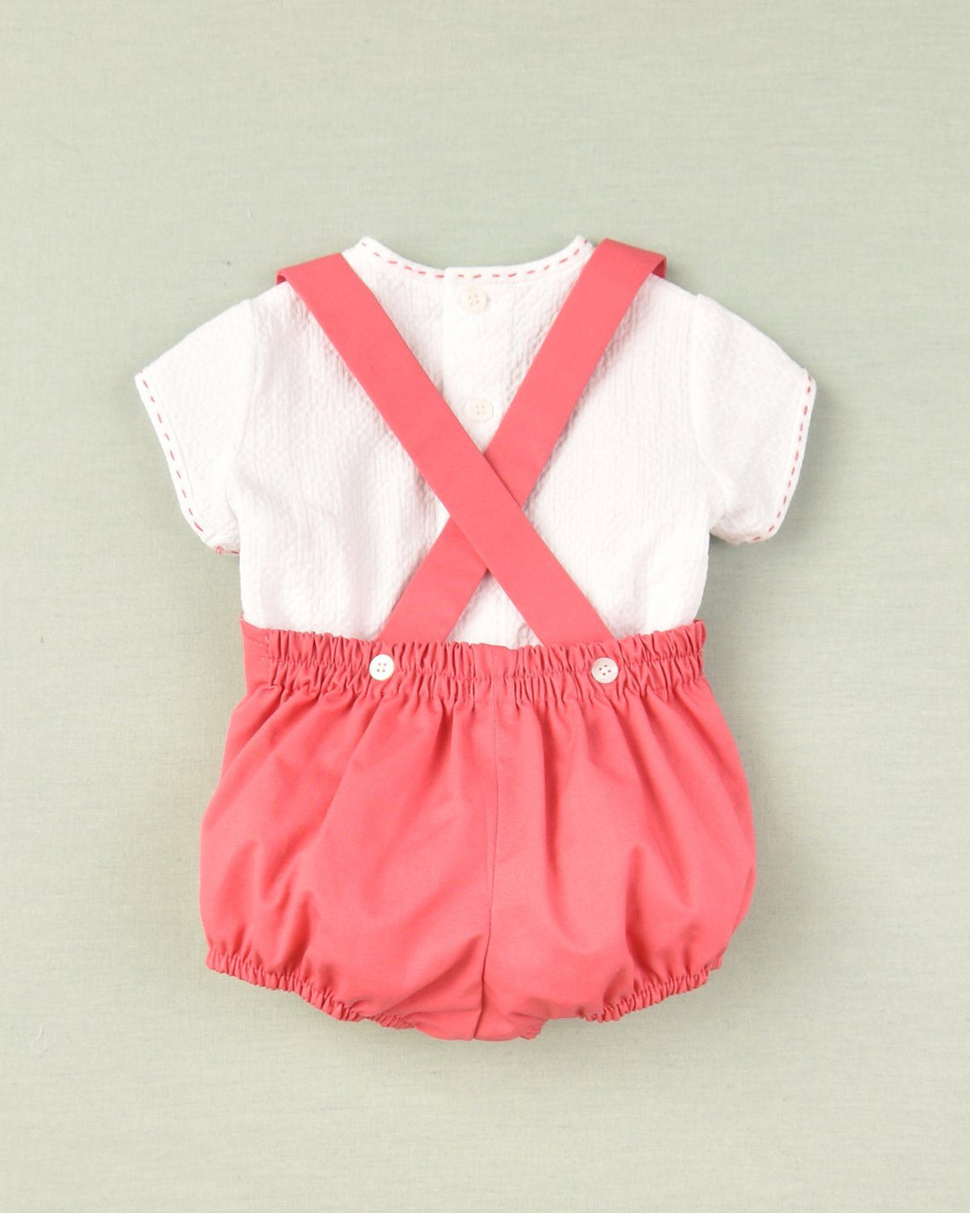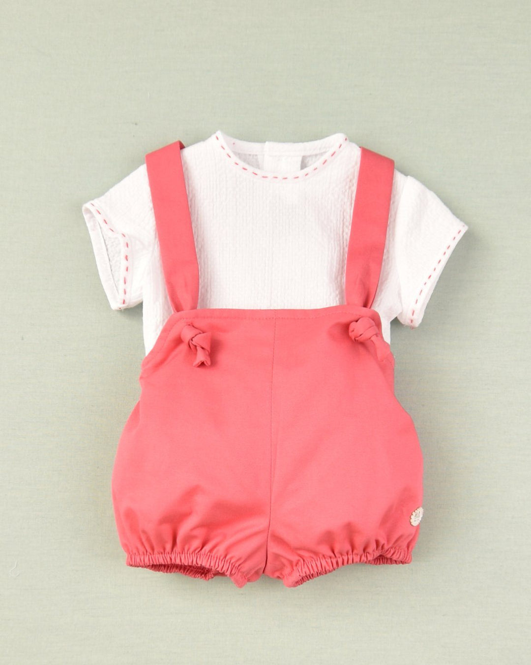 طقم ملابس صيفي من ماركة خوسيه فارون الإسبانية. تيشيرت أبيض مزخرف بخياطة فوشيا متباينة على الرقبة والأكمام، أسفل بنطال فوشيا ضيق بحمالات معقودة. تتوفر تصاميم متناسقة.