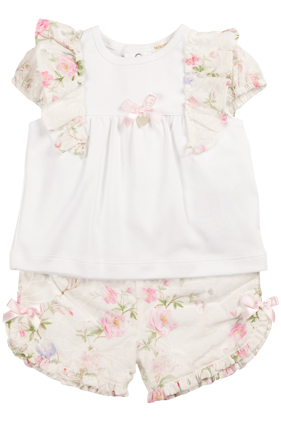 مجموعة مينتيني المكونة من قطعتين، زي جميل ورقيق للفتيات الصغيرات، تتميز بجزء علوي من قطن الجيرسي العاجي مع أكمام ناعمة مزينة بكشكشة مطرزة بنقشة الأزهار الإنجليزية، ومزينة بفيونكة من الساتان الوردي وسحر على شكل قلب جميل.