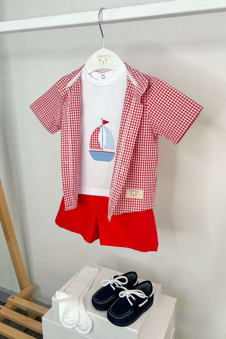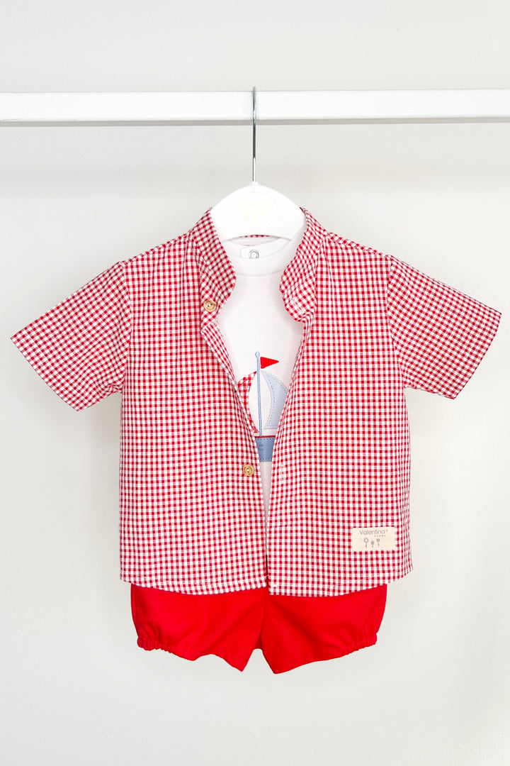طقم مرح وأنيق للمستكشفين الصغار! هذا الطقم المكون من ثلاث قطع من فالنتينا بيبيز يتضمن قميصًا مربعات أحمر وأبيض بأزرار، مثالي للارتداء فوق ملابس أخرى. تحته، تيشيرت ناعم وخفيف الوزن مزين بتطريز مركب شراعي، يضفي لمسة بحرية. يكتمل الطقم ببنطال قطني أحمر - بنطال ضيق للأولاد الصغار (١٨ شهرًا) وشورت أنيق طويل للأولاد الأكبر سنًا (٢٤ شهرًا فأكثر). مصمم لتوفير الراحة والأناقة البسيطة، هذا الطقم لا غنى عنه للأيام المشمسة واللحظات المميزة.