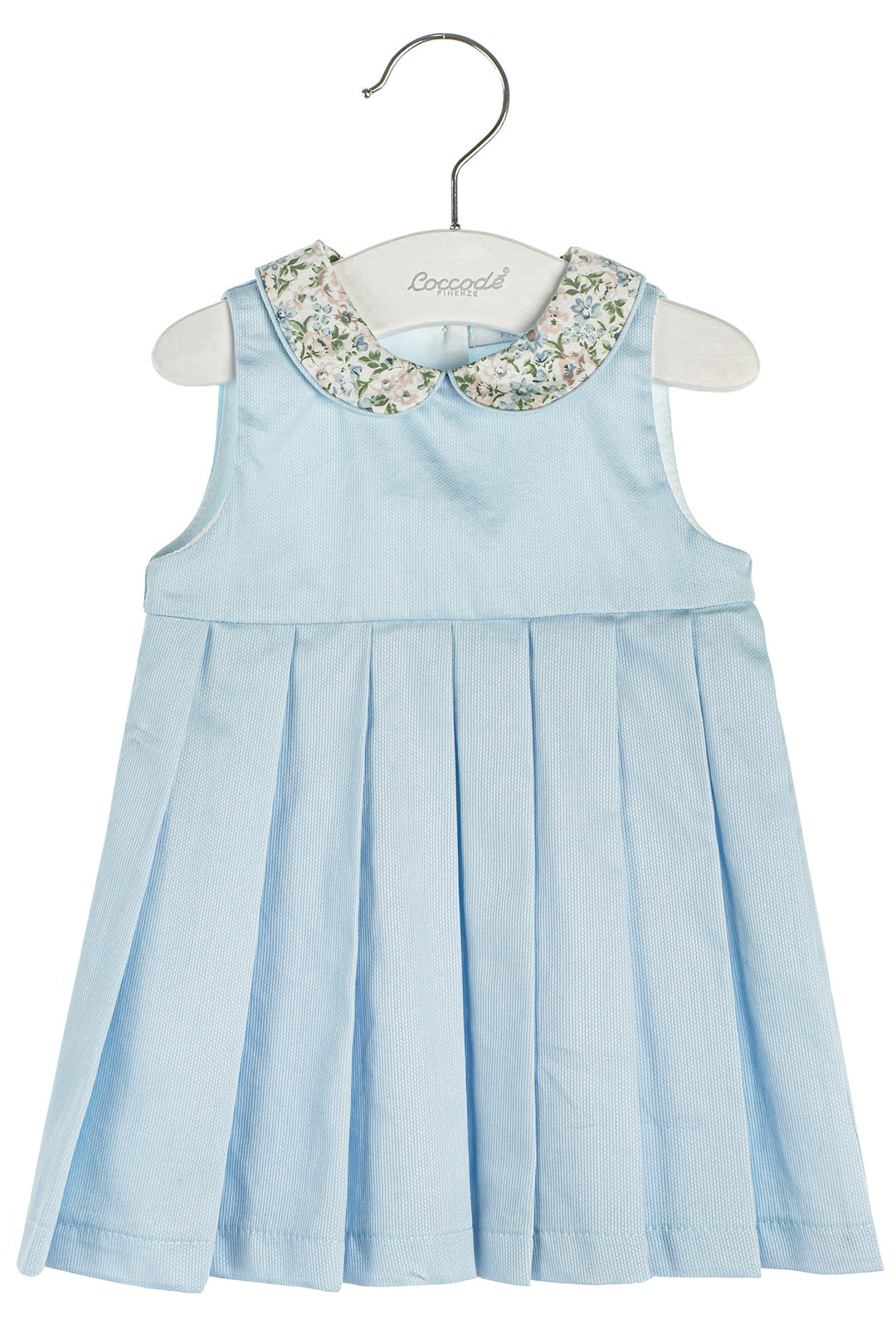 فستان طفلة من ماركة كوكود الإيطالية. فستان خفيف الوزن من القطن المنسوج باللون الأزرق الفاتح، مع ياقة مستديرة بطبعة زهور كلاسيكية جميلة.