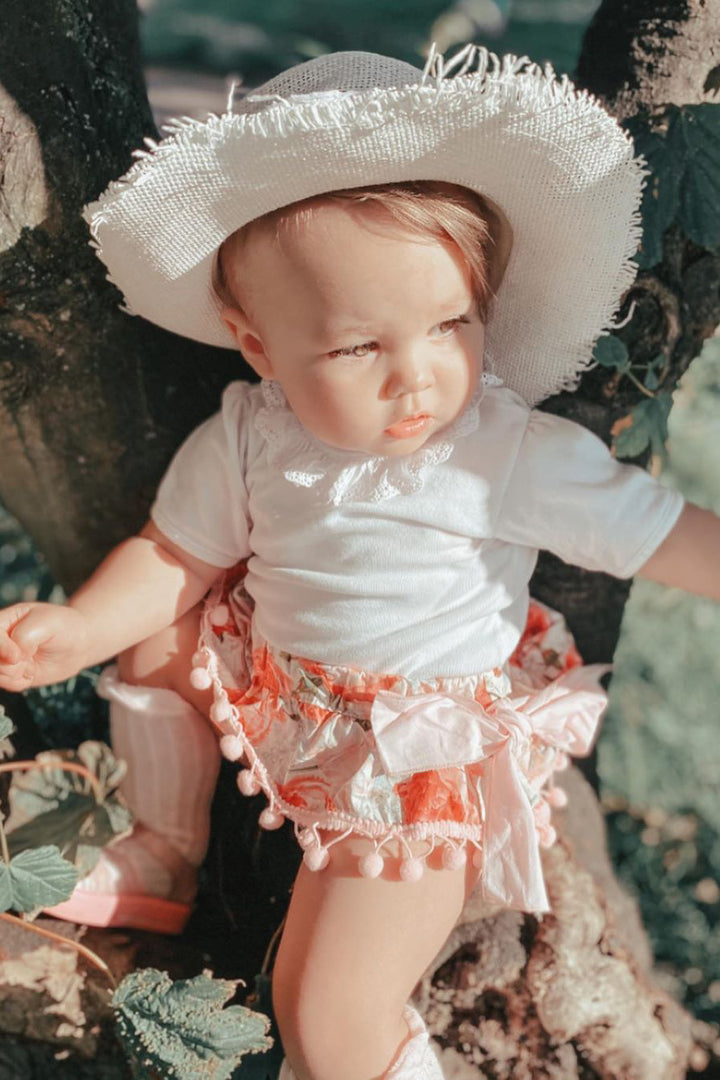 بلومرز بطبعة ورد جميلة من ماركة برتغالية في . سروال داخلي ناعم وخفيف الوزن مع تنورة مكشكشة جذابة، مزينة بزخرفة بوم بوم وردية مرحة على طول الحافة وربطتين ورديتين كبيرتين على كل جانب.