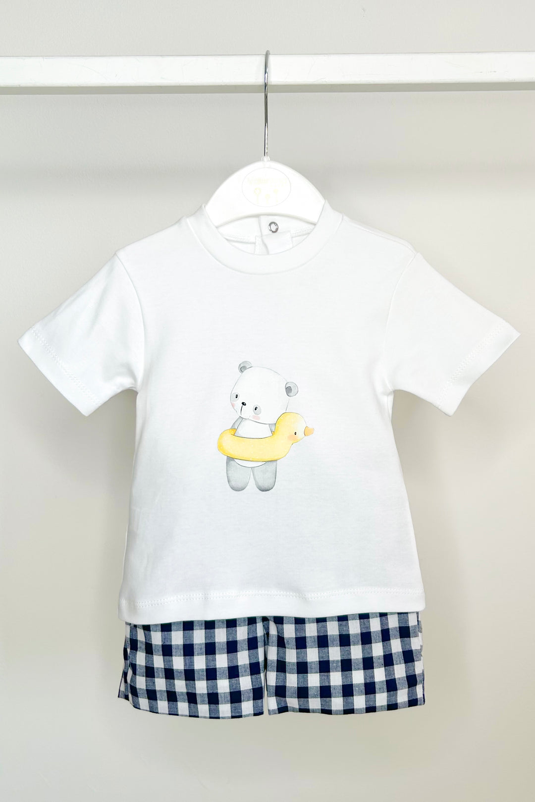 أضفِ لمسةً من البهجة إلى خزانة ملابس طفلك الصيفية مع هذه المجموعة الرائعة من ثلاث قطع من فالنتينا بيبيز . تتميز البلوزة الصفراء الناعمة بطبعة باندا ترتدي عوامة بطة، وتُلبس فوق تي شيرت أبيض بأكمام قصيرة بنفس التصميم. المقاسات من ١٨ شهرًا تشمل بنطالًا كلاسيكيًا بأرجل مطاطية، بينما تأتي المقاسات من ٢٤ شهرًا فما فوق مع شورت مربعات مربعات مريح ومبطن. يُغلق كلا القميصين من الخلف بأزرار أو كباسات لسهولة الارتداء. مثالية لأيام الشاطئ، ولقاءات اللعب، وجميع مغامراته المشمسة.