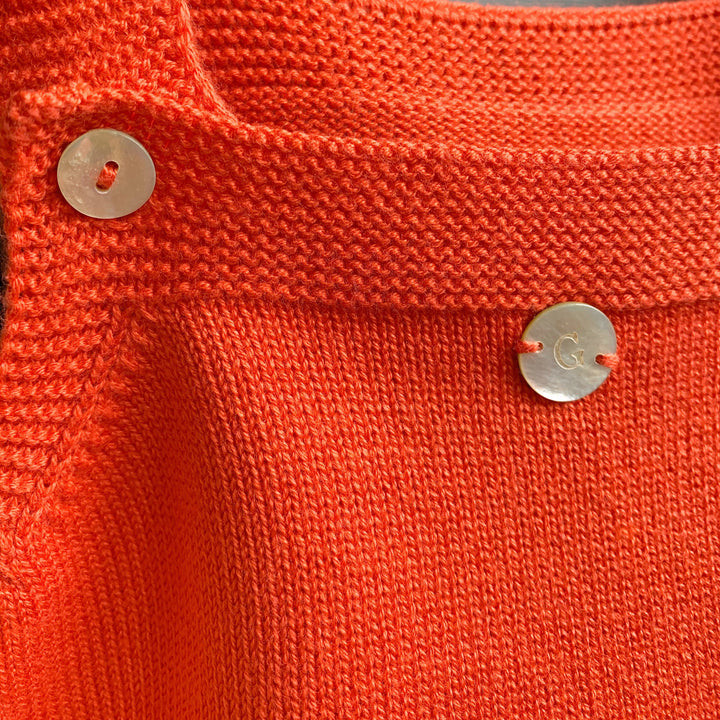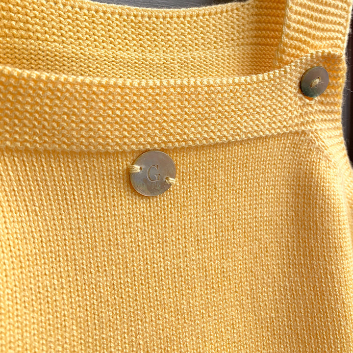 إذا كنت ترغب في شراء رومبر دنغري محبوك هذا الموسم، فاجعله من العلامة التجارية الإسبانية أرتيسانيا غرانلي . رومبر دانغري محبوك فائق النعومة، مُزين بقرص فاخر من عرق اللؤلؤ الطبيعي، محفور عليه حرف "G" في المنتصف. أزرار مطابقة من عرق اللؤلؤ تُغلق على الأشرطة والعكاز. اختاري بين الأصفر الباهت أو الأحمر الداكن.