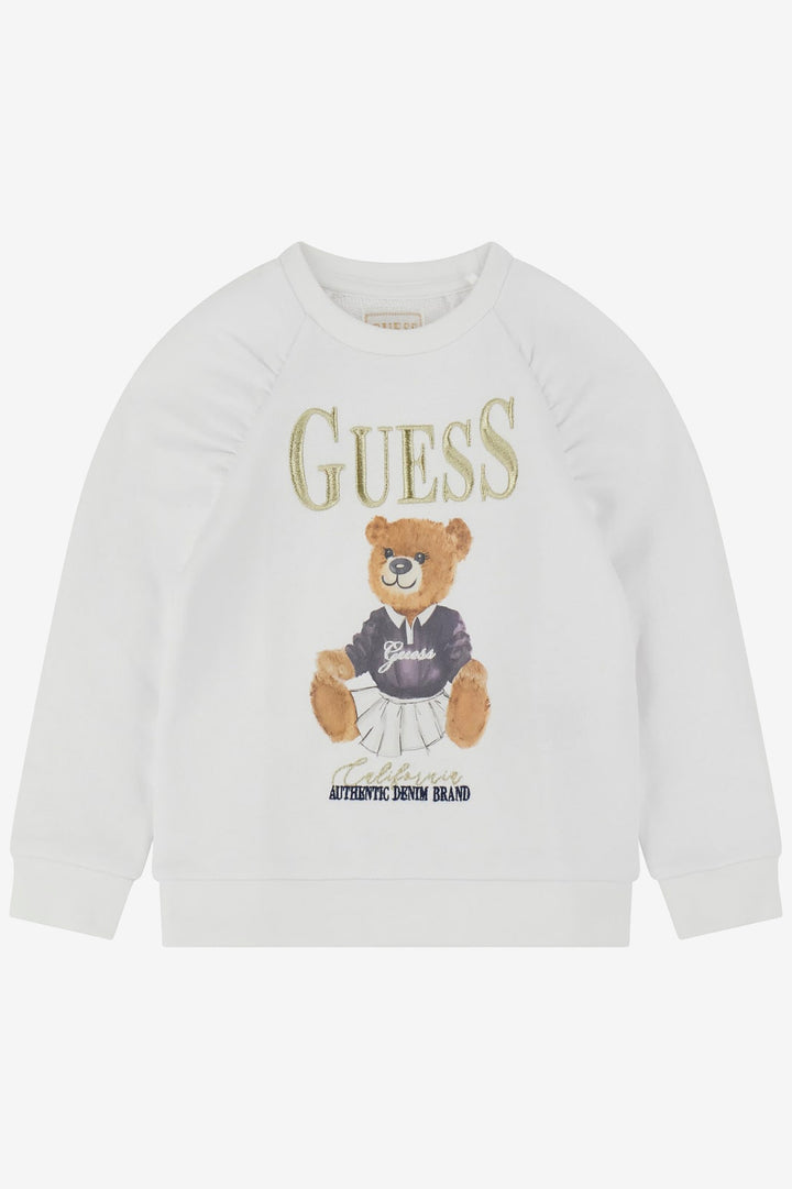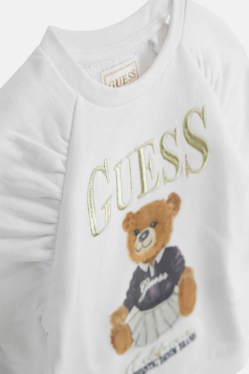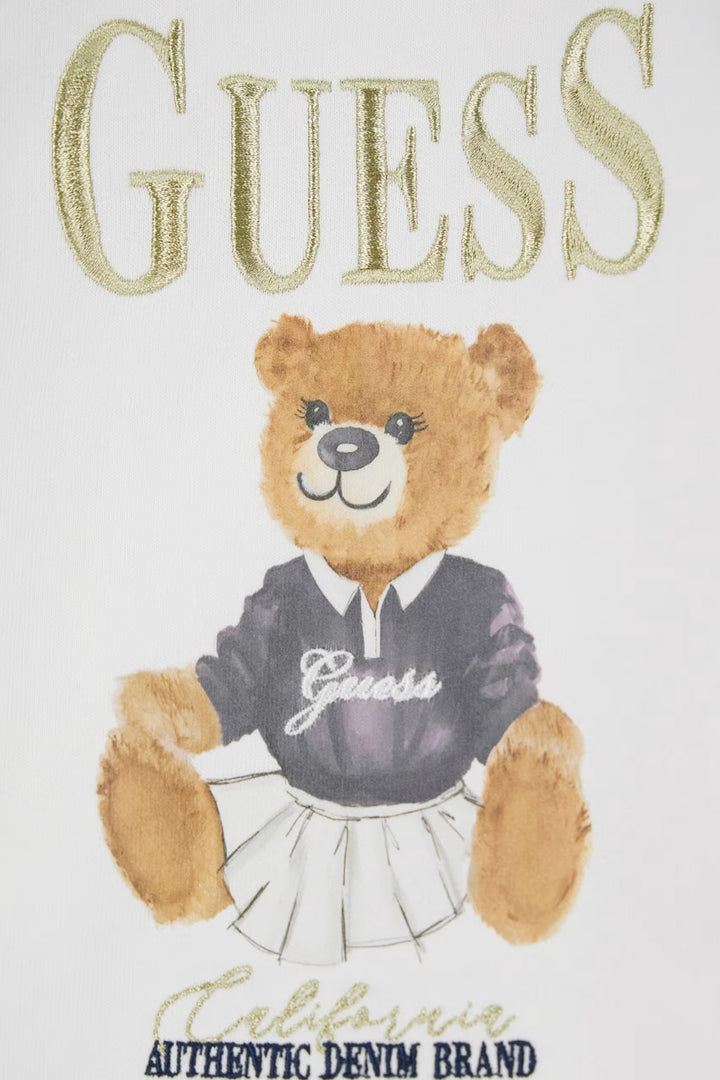 خيار أنيق ومريح لعشاق الموضة الصغار، يتميز هذا السويت شيرت الأبيض من GUESS® Kids بنقشة دب رياضية وشعار "GUESS" مطرز ثلاثي الأبعاد باللون الذهبي المعدني لإضفاء لمسة فاخرة. يُضفي تصميم الأكمام المكشكش لمسة أنثوية، بينما يضمن الجزء الداخلي ذو النسيج المزخرف راحةً طوال اليوم. مصنوع من قطن خفيف الوزن 100%، مثالي للارتداء فوق السراويل الضيقة أو الجينز لإطلالة كاجوال أنيقة.