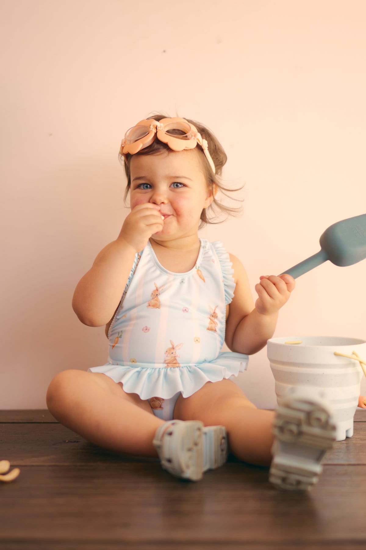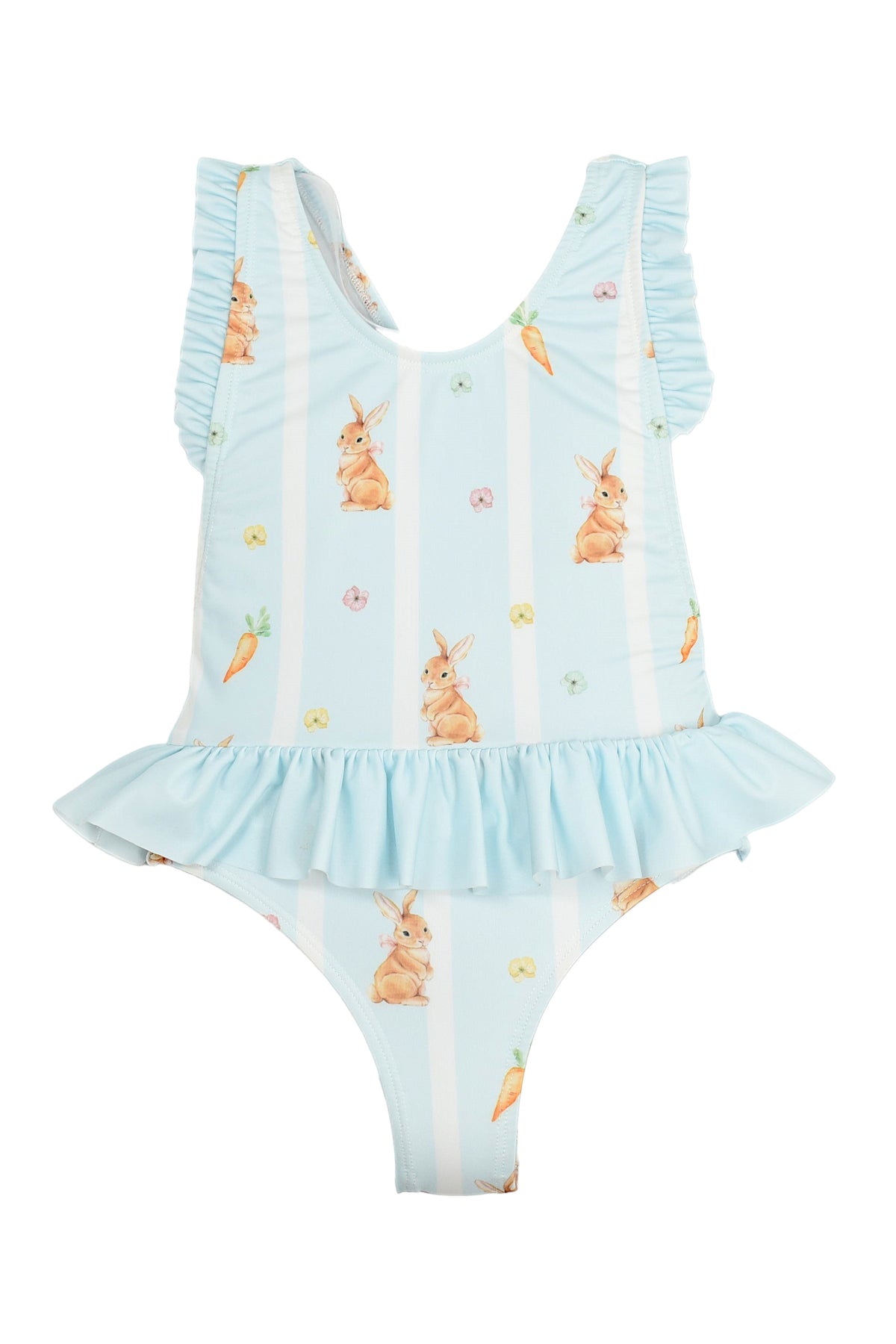 The Saona swimsuit in the Bunnies print from Meia Pata is one of those styles that feels instantly special. Soft pastel blue stripes are scattered with the sweetest hand-drawn bunnies, carrots and tiny florals, creating a gentle, playful look that still feels timeless.