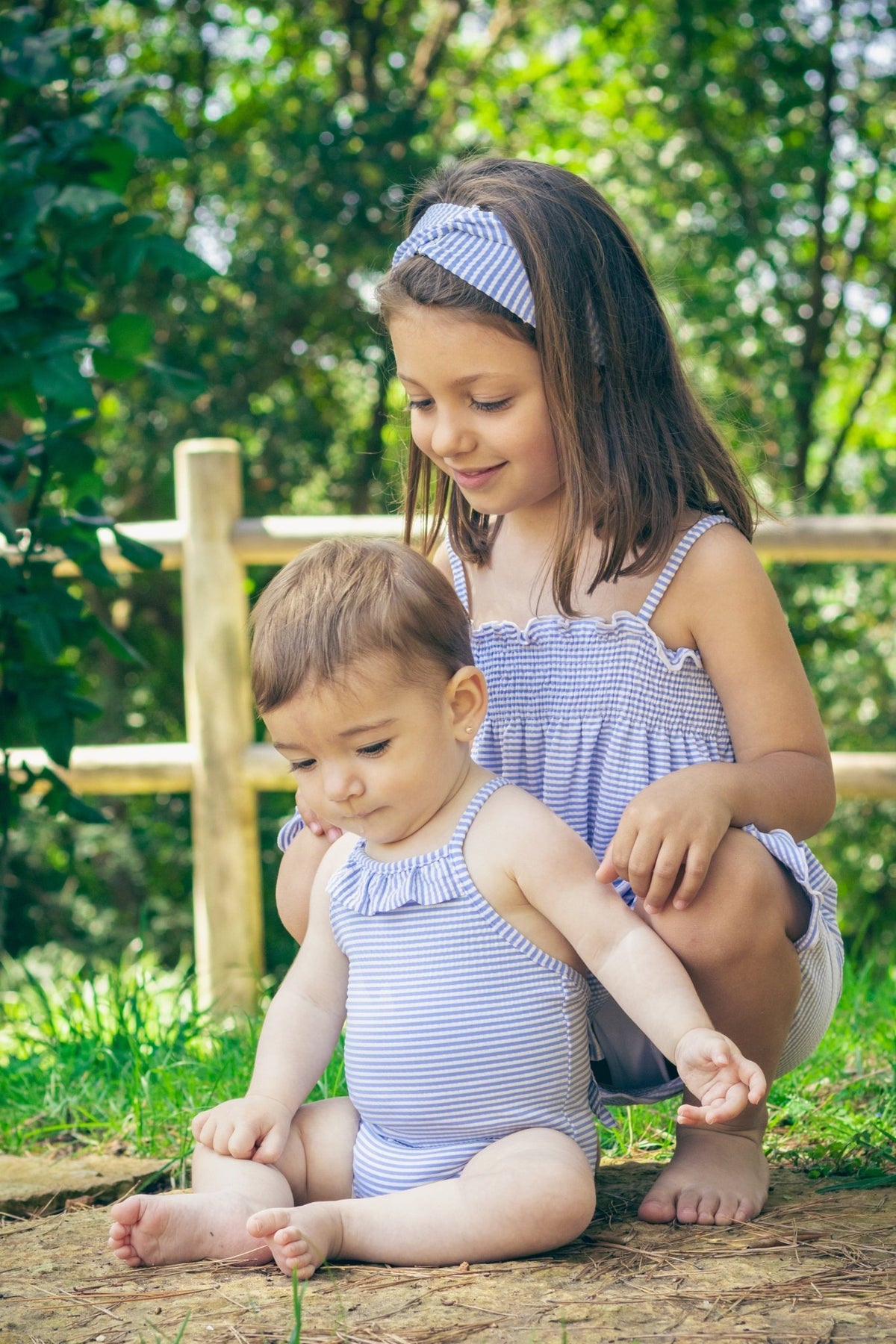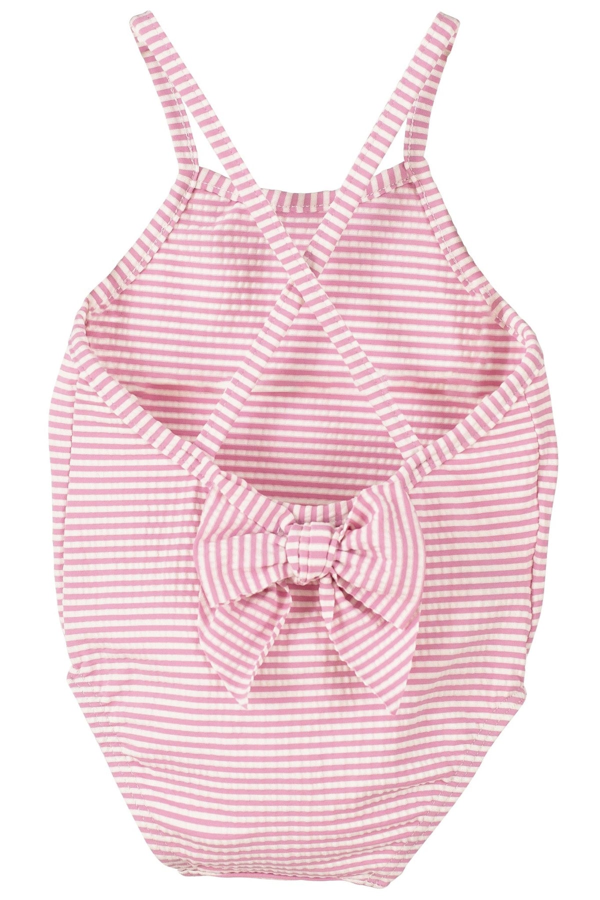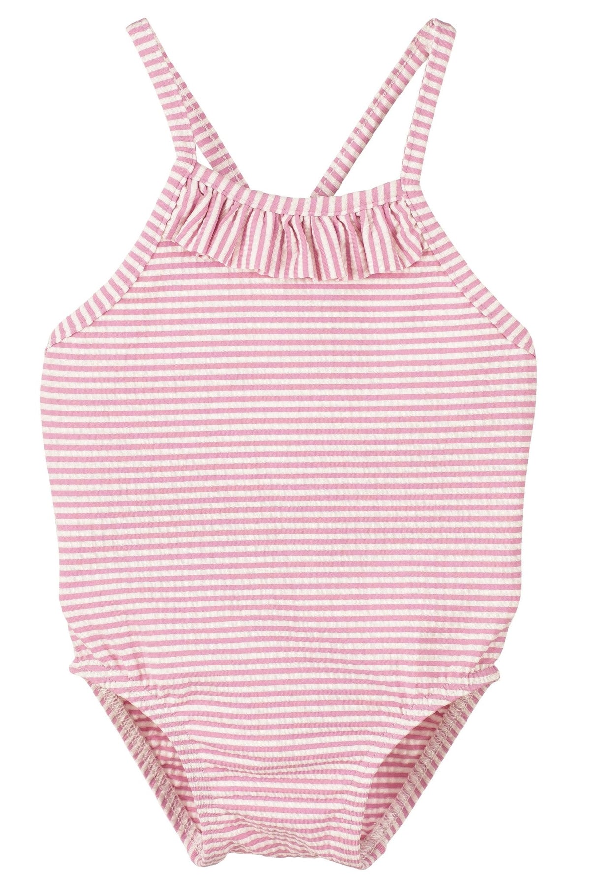 زي سباحة مخطط من قماش السيرساكر لطفلة من ماركة كالامارو الإسبانية. خفيف الوزن للغاية، مزين بكشكشة أنيقة على الصدر.