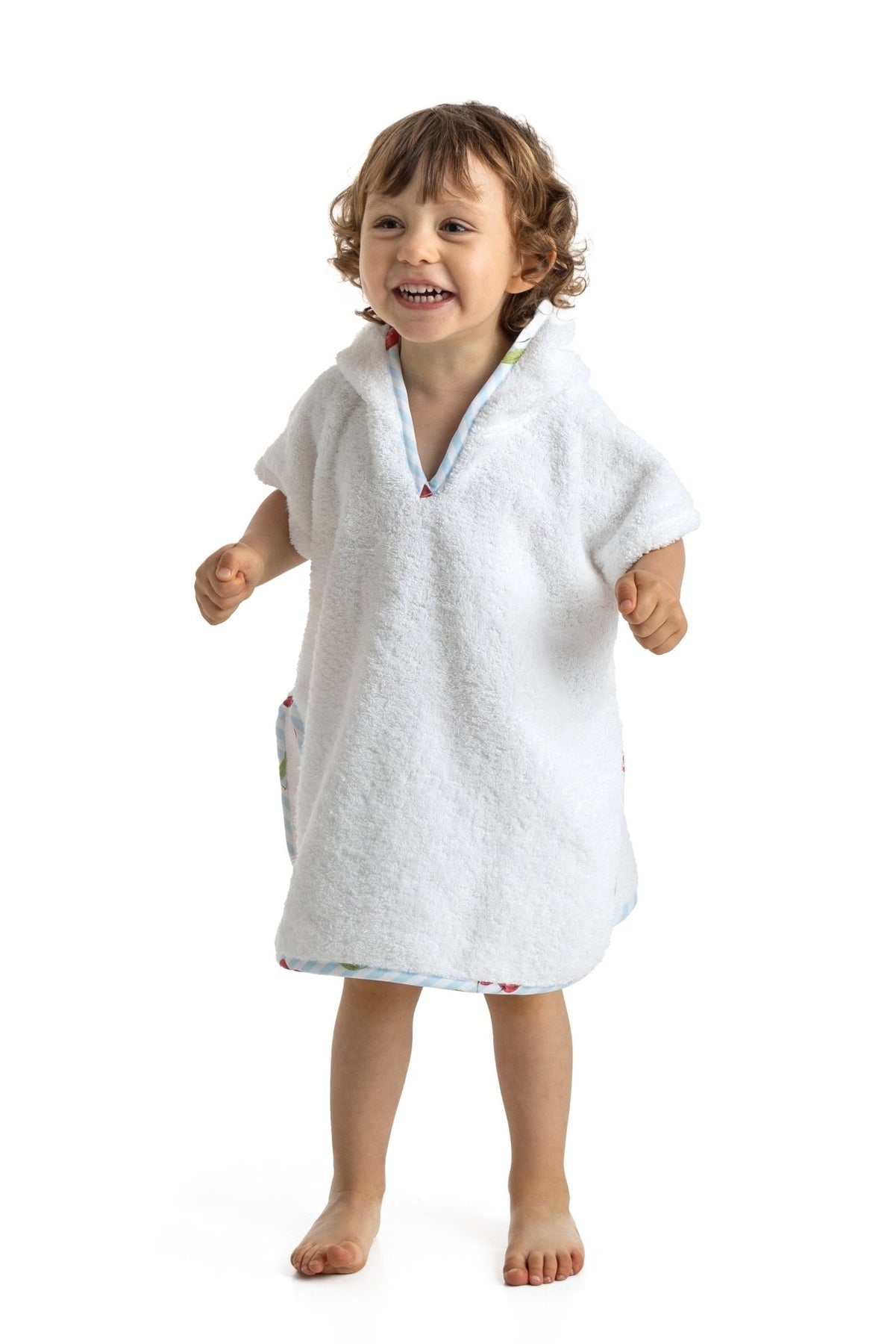 بونشو شاطئ للجنسين بطبعة كرز من ماركة ميا باتا البرتغالية. يتميز هذا البونشو الأبيض بأكمام قصيرة وغطاء رأس وجيب كنغر وحواف مخططة باللونين الأزرق والأبيض بطبعة كرز حمراء.