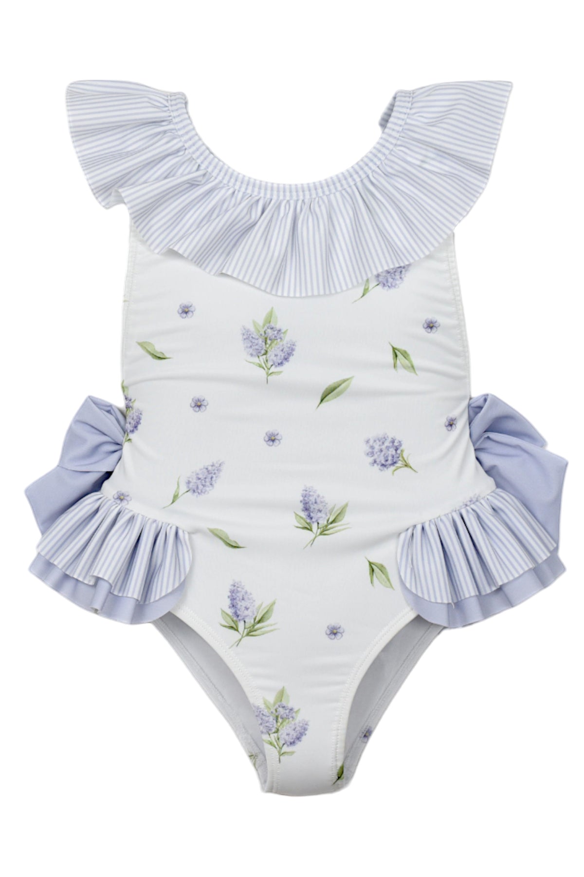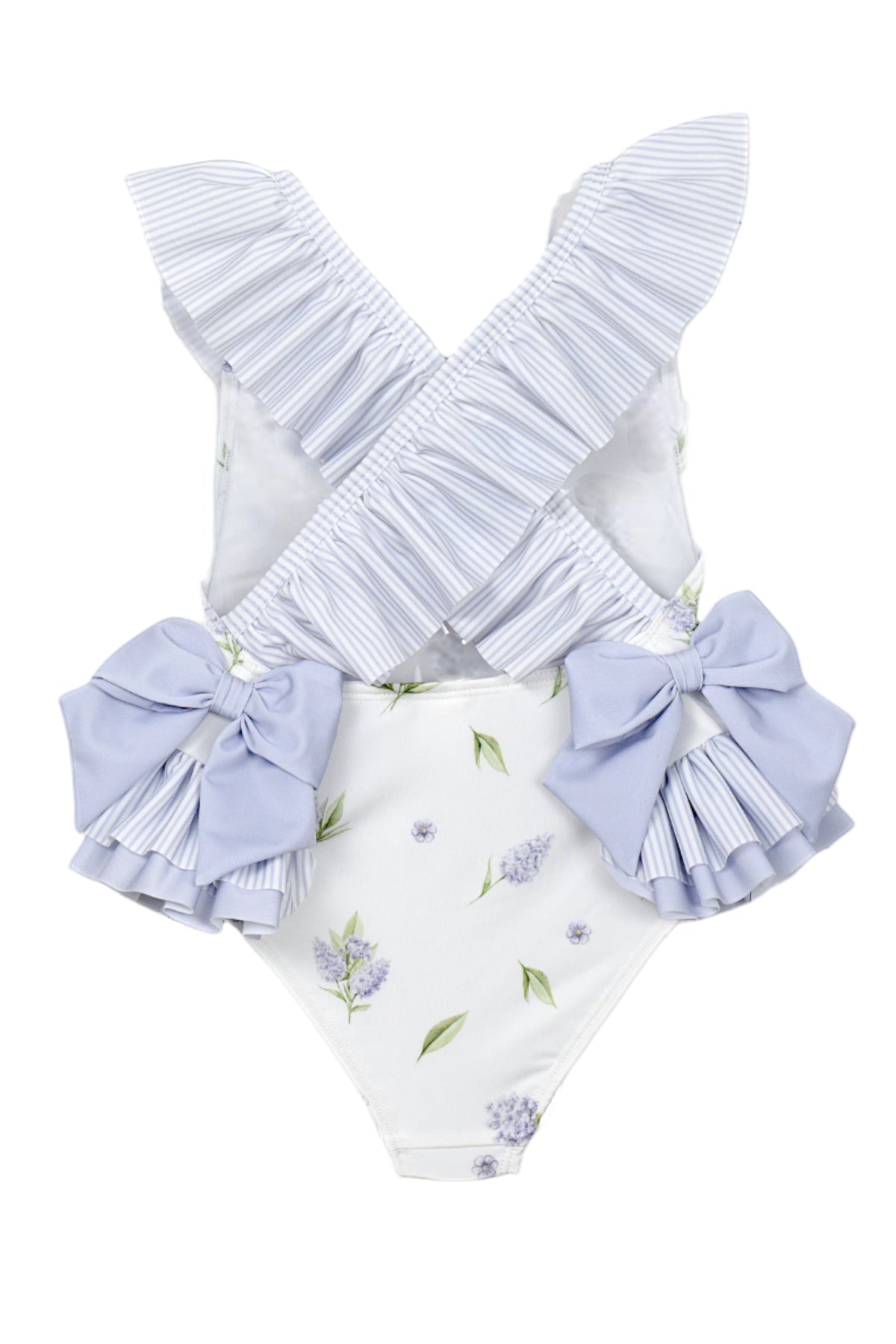 Fully lined for comfort, this style features a delicate lavender floral print, with ruffled trims at the shoulder straps and hips for a playful yet timeless silhouette. Stretchy cross-over straps ensure a secure, flexible fit, while the statement bow at the back adds a truly special finishing touch – perfect for beach days, holidays and family photos.