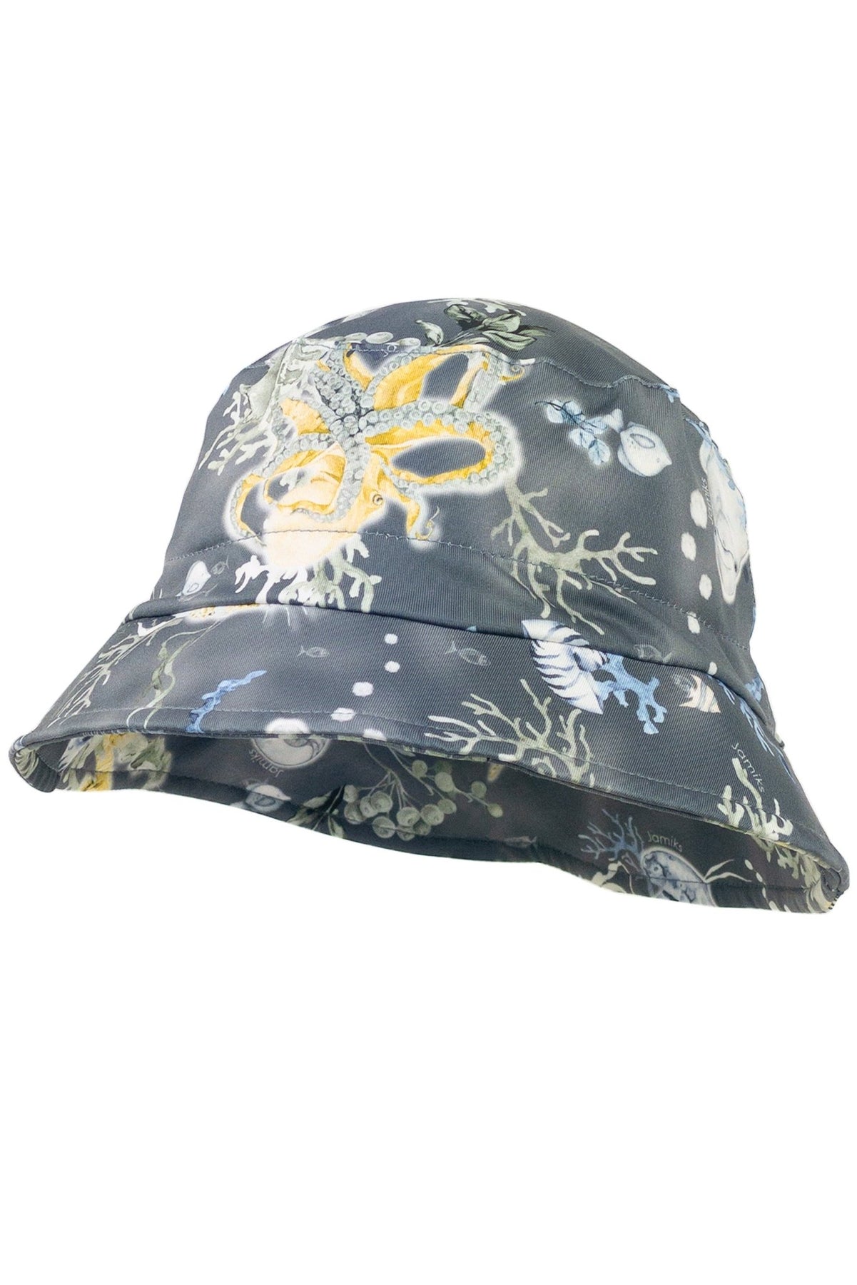 قبعة شمس للأولاد من العلامة التجارية البولندية Jamiks . قبعة شمس مطبوعة باللون الأزرق البحري مع قفل قابل للتعديل في الخلف، مصنوعة من نسيج حريري ناعم للغاية ومحمي بعامل حماية من الشمس 50+.